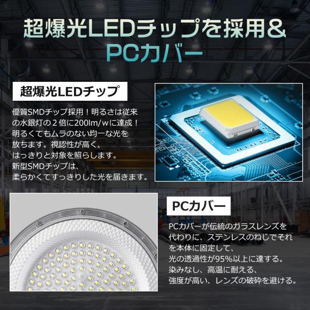 従来の製品と比較して約80%の省エネで同等の明るさを実現し、高演色LEDチップを使用して広範囲を均一に照射します。さらに、SMDチップの高光効率により、明るさと省電力、長寿命を実現し、価格もお手頃です。IP6xの防塵設計で過酷な環境でも安定したパフォーマンスを発揮し、強化PCカバーと優れた放熱性能により、長寿命を維持します。紫外線フリーで虫が寄らず、低温でも効率が落ちません。