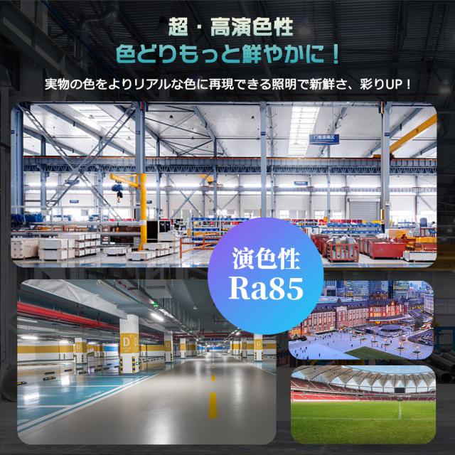 - 室内で、ガレージ照明、倉庫照明、工場照明、商業施設照明、体育館照明などとして幅広く適用できる。