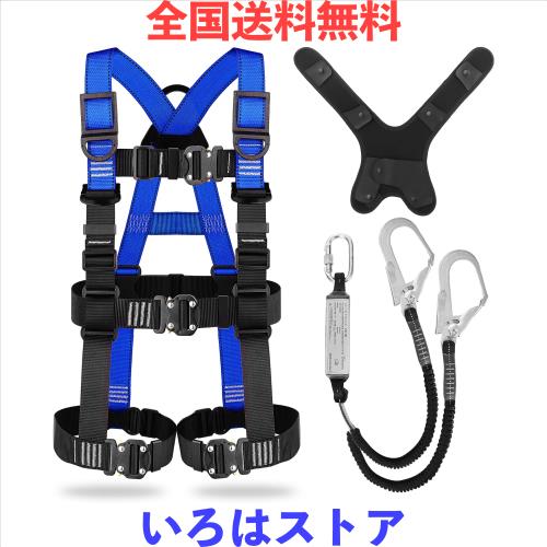 【フルハーネスセット仕様】「材質」ベルト:高強度ポリエステル。バックルとD環:合金鋼。「仕様」ハーネス安全帯 新規格 セットの重量:約2.9kg、参考適合身長:150cm-200cm、各部が調節可能フリーサイズ、腰回り:80-120cm、腿回り:40-85cm、使用可能質量:100kg以下(使用可能質量とは、着用者の体重と装備品の全ての質量を合計した最大値です)。「二丁掛けランヤード」ショックアブゾーバ種別:第一種(4kN)、最大自由落下距離:2.5m、ランヤード長さ:蛇腹伸縮式120-180cm。