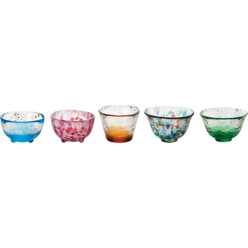 日本の四季を色で表現する事がコンセプトの津軽びいどろ。多彩な色を生み出せるからこそ実現した盃5客セットです。専用化粧個に入れてお届けいたします。