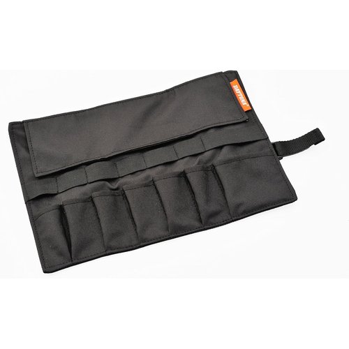 ひとめで必要な工具を見つけることができるナイロン製ロール式ツールバッグ。工具の落下を防止するカバーとゴムバンド付き。カバーは大型なので、短い工具でもケースから脱落しにくく、サイズの違う収納ポケットは工具の整理収納が可能です。丸めた状態に合わせ、バンドの長さを調節できます。