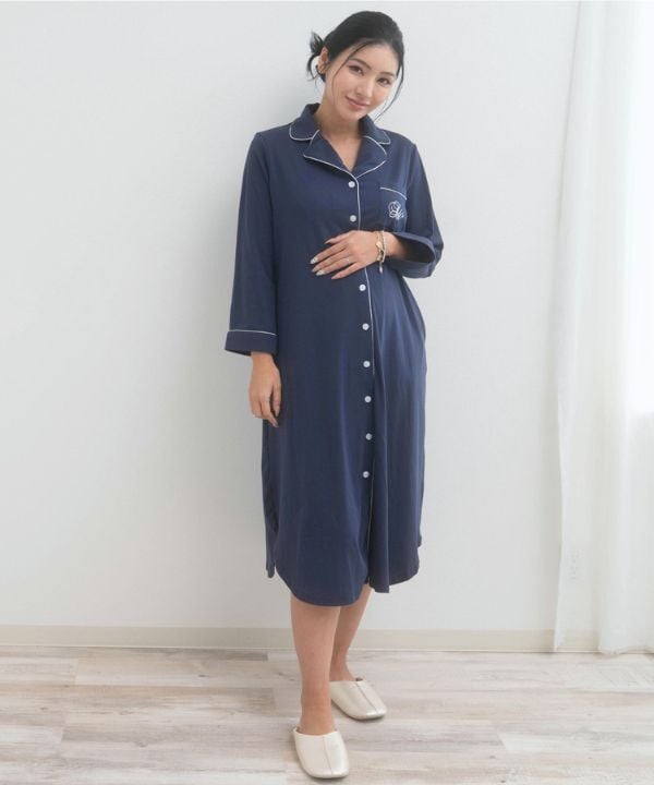 入院にも対応できる前開きで、臨月までゆったり着られるワンピースタイプです。