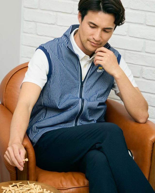サッカー素材を使用したベストです。清涼感のある見た目に加え、吸水速乾の機能をプラスしました。カットソーなので、シワ等気にせず気軽に持ち運べます。初夏の軽い羽織にオススメです。