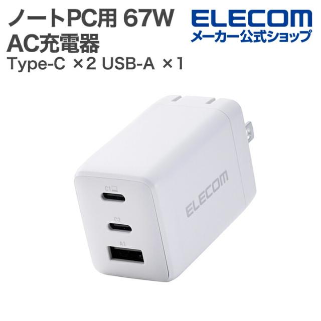 エレコム ノートPC用 ACアダプター USB Power Delivery 67W AC充電器 C×2+A×1 USB充電器 Type-C ×2 USB-A ×1 スイングプラグ ホワイト ┃EC-AC10367WH