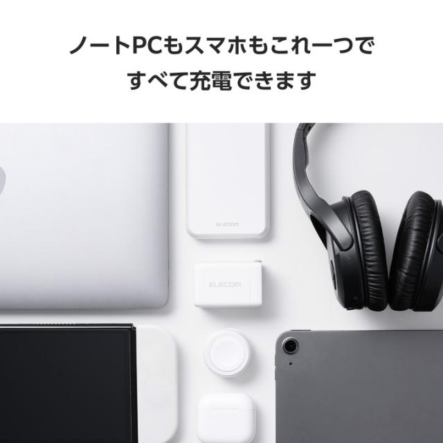 スマホ・ワイヤレスイヤホン・ノートパソコンを3台同時充電OK!コンパクトながらUSB-AとUSB Type-C(TM)、いずれのケーブルも接続できるAC充電器です。USB Power Delivery 67Wの高出力で幅広い機器をしっかり充電できます。