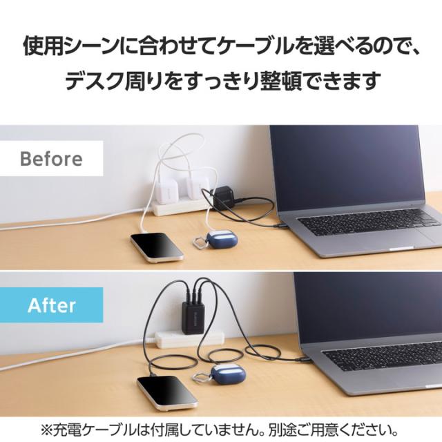 スマホ・ワイヤレスイヤホン・ノートパソコンを3台同時充電OK!USB Type-C(TM)×3ポートを搭載したAC充電器です。USB Power Delivery 67Wの高出力で幅広い機器をしっかり充電できます。