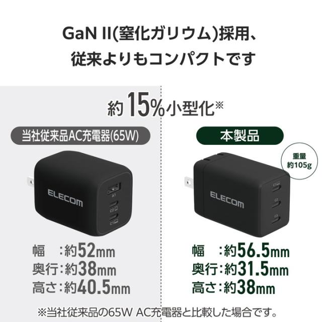 スマホ・ワイヤレスイヤホン・ノートパソコンを3台同時充電OK!USB Type-C(TM)×3ポートを搭載したAC充電器です。USB Power Delivery 67Wの高出力で幅広い機器をしっかり充電できます。![]() ■3つの出力ポートを搭載。用途に合わせて接続先を使い分けられるから、スマートフォンやノートパソコン、タブレット、ワイヤレスイヤホンなどを組み合わせて同時に充電できるAC充電器です。 ■USB Type-Cポートへの1ポート接続時は、USB Power Delivery 67Wを出力。ノートパソコンを十分な速度で充電できます。 ■2ポート同時接続時は10W〜45W、3ポート同時接続時は10W〜40Wでの出力が可能。スマートフォンやタブレット、ワイヤレスイヤホン、電子タバコなどのデバイスを同時に充電できます。 ■GaN II(窒化ガリウム)を採用し、高出力ながらコンパクトサイズを実現。プラグ部分も折り畳むことができるため、バッグの中でもスペースを取らず、ビジネスでの外出やリモートワーク、出張、旅行など持ち運びにも便利です。 ■MacBook付属のUSB-C - MagSafe 3ケーブルも使用可能。MacBookの充電をスムーズに行えます。 ■USB Power DeliveryおよびPPS規格に対応。機器に応じて電圧、電流が変化するため、スマートフォンやタブレットはもちろん、Windowsノートパソコンも幅広い機種を充電できます。 ■※USB Power Deliveryとは、アダプターと接続機器間で情報をやり取りすることで、その機器間における最適な電力を選択し、高速充電を実現するUSB規格です。PPS(Programmable Power Supply)とは、0.02V単位で電圧を調整し、最適な電力で効率的に供給することができるUSB Power Deliveryのオプション規格です。 ■※本製品のUSB Power Delivery最大出力は67Wです。PPS(Programmable Power Supply)最大出力は55Wです。 ■Thermal Protectionを搭載し、製品温度の上昇を24時間監視・制御。自動で出力をコントロールし、お使いの機器を守ります。 ■本製品はUSB-IFのテストと同等のテストを当社独自で実施し、USB Power Delivery対応製品との高い互換性が保たれています。 ■電気用品安全法(PSE)認証品です。また、当社独自のテストを実施した、高い安全性が確認された製品になります。 ■電気用品安全法の耐トラッキング性の要求事項を満たしたコンセントプラグを採用しています。 ■※充電ケーブルは同梱していません。別途ご用意ください。 ■※機器本体や充電器が濡れた状態で充電すると、異常な発熱・焼損の原因となり大変危険ですのでおやめください。 ■※USB Type-C and USB-C are trademarks of USB Implementers Forum. ■自社環境認定基準を1つ以上満たし、『THINK ECOLOGY』マークを表示した製品です。 ■廃棄物削減に取り組み、製品に同梱する取扱説明書等をペーパーレス化した製品です。 ■環境保全に取り組み、製品の包装容器におけるプラスチック重量を、社内基準製品より20%以上削減した製品です。 ■環境保全に取り組み、製品の包装容器が紙・ダンボール・ポリ袋のみで構成されている製品です。 ![]() ■対応機種:各USB Type-C(TM)ポートからUSB Power Delivery 67WおよびPPS 55Wの規格内で充電可能なノートパソコン、スマートフォンなどの機器。2ポート以上同時接続時、合計最大65Wまでの出力で充電・給電可能な機器とその組み合わせ ■コネクター形状:USB Type-Cポート×3 ■定格入力電圧:AC100〜240V、50/60Hz ■定格入力電流:2A ■定格出力電力(単独接続時):USB Type-C1/C2/C3ポート:最大出力67W、PPS最大出力55W ■定格出力電力(2ポート同時接続時(1)):USB Type-C1+USB Type-C2/C3ポート:合計最大出力65W、USB Type-C1ポート最大出力45W、PPS最大出力33W、USB Type-C2/C3ポート最大出力20W ■定格出力電力(2ポート同時接続時(2)):USB Type-C2+USB Type-C3ポート:合計最大出力20W、USB Type-C2/C3ポート最大出力10W ■定格出力電力(3ポート同時接続時):合計最大出力60W、USB Type-C1ポート最大出力40W、PPS最大出力33W、USB Type-C2/C3ポート最大出力10W ■定格出力電圧(単独接続時):USB Type-C1ポート:5V/9V/15V/20V、PPS出力3.3〜11V、USB Type-C2/C3ポート:5V/9V/15V/20V、PPS出力5〜11V ■定格出力電圧(2ポート同時接続時(1)):[USB Type-C1+USB Type-C2/C3ポート接続時]USB Type-C1ポート:5V/9V/15V/20V、PPS出力3.3〜11V、USB Type-C2/C3ポート:5V/9V ■定格出力電圧(2ポート同時接続時(2)):[USB Type-C2+USB Type-C3ポート接続時]USB Type-C2/C3ポート:5V ■定格出力電圧(3ポート同時接続時):USB Type-C1ポート:5V/9V/15V/20V、PPS出力3.3〜11V、USB Type-C2/C3ポート:5V ■定格出力電流(単独接続時):USB Type-C1ポート:5V/9V/15V時3A・20V時3.35A、PPS出力3.3〜11V時5A、USB Type-C2/C3ポート:5V/9V/15V時3A・20V時3.35A、PPS出力5〜11V時5A ■定格出力電流(2ポート同時接続時(1)):[USB Type-C1+USB Type-C2/C3ポート接続時]USB Type-C1ポート:5V/9V/15V時3A・20V時2.25A、PPS出力3.3〜11V時3A、USB Type-C2/C3ポート:5V時3A・9V時2.22A ■定格出力電流(2ポート同時接続時(2)):USB Type-C2+USB Type-C3ポート:USB Type-C2/C3ポート:5V時2A ■定格出力電流(3ポート同時接続時):USB Type-C1ポート:5V/9V時3A・15V時2.67A・20V時2A、PPS出力3.3〜11V時3A、USB Type-C2/C3ポート:5V時2A ■外形寸法:幅約56.5mm×奥行約31.5mm×高さ約38mm ■重量:約105g ■カラー:ブラック ■コ