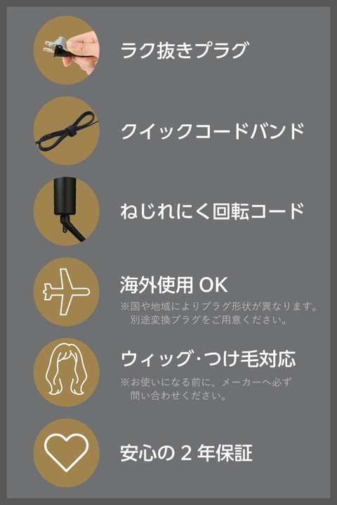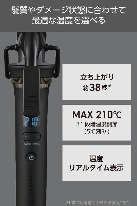 サロンテクニックとシルクのなめらかさで、くっきり艶カールもゆるふわカールも美しく再現する、プロ仕様のカールアイロンです。シルクコーティング(TM)プレートが水分の蒸発を抑えて潤いを守り、ヘアカラーの退色を軽減。はさみ圧の調整機能も搭載し、毎日のスタイリングをサロン級の仕上がりに導きます。![]() ■髪すべりがなめらかなシルクコーティング(TM)プレートを搭載。髪の水分の蒸発を抑制することで、髪に残る水分量が約25%アップ(※1)。ヘアカラーの退色を約66.7%低減(※2)します。髪のうるおいを守り、ヘアカラーを美しく保ちます。 ■※1:設定温度200℃のヘアアイロンNIS500A・NIS500Bを使用。健常毛1束に対して、30cmあたり4秒間かけてストロークし、連続的に10回施術した際の各コーティングの施術前後の水分量を計測。 ■※2:設定温度200℃のヘアアイロンNIS500A・NIS500Bを使用。カラー処理毛1束に対して、15cmあたり2秒間かけてストロークし、連続的に10回施術した際の前後の色差を計測。 ■ダイヤルを回すとクリップのはさみ圧が調節できる、アジャスタブルクリップを搭載。髪を挟む強さを髪質や希望のスタイリングに合わせて調節できます。なりたいスタイルに合わせてはさみ圧を変えることで、くっきりカールからふんわりカールまでさまざまな表情のスタイリングが可能です。 ■ロングヘアでも一気に巻けるロングバレルを採用しています。 ■バレルの左右には、髪にフィットするシリコンバーを搭載。 細かい毛束も逃さずキャッチ。適度なテンションがかかり、キレイに巻けます。 ■温度幅60〜210℃の間で、5℃刻み31段階の細やかな温度調節が可能。髪質やダメージ状態に合わせて最適な温度を選べます。 ■電源ONから約38秒で立ち上がるから、 忙しい朝でも快適にご利用いただけます。 ※100℃到達時間(最高温度設定時) ■プレート温度をリアルタイム(5℃刻み)に表示し、 設定温度到達までの目安がわかります。加熱完了は電子音でお知らせします。 ■前回設定した温度が自動で設定される、温度メモリー機能を搭載。使う度温度設定を行うわずらわしさがありません。 ■設定後約5秒で温度ロックがかかります。使用中に誤ってダイヤルに触れても温度が変わることはありません。 ■プロテクトイオン搭載。マイナスイオンとプラスイオンを同時に放出します。 ■自動電源OFF機能を搭載。最後に操作してから約30分後に自動で電源が切れるため、安全に使用できます。 ■プロに支持される「Nobby」ブランドの世界観を受け継いだ、洗練されたフォルムが魅力。マットな質感にクロムメッキのアクセントが映える、上質なデザインです。 ■電源コードが本体取り付け部で360度回転。ねじれにくく使いやすいです。 ■クイックコードバンド付きなので、ばらつきがちな電源コードもすっきりまとまり収納も簡単です。 ■ラク抜きプラグ搭載。力の弱い方やお年寄り、爪の長い方やネイルをしている方でも、レバーを押すだけで簡単にプラグを抜くことができます。 ■AC100-240Vの地域で使用できます。海外旅行の際にも使えて便利です。 ■※国や地域によりプラグ形状が異なります。 別途変換プラグをお買い求めください。 ■業務用の高い設計基準で安心の2年保証です。 ■※業務用で使用された場合の故障は、保証期間内であっても有料修理となります。 ■サロンシェアNo.1(数量ベース)(※)ブランド『Nobby』から生まれたNobby by TESCOM。洗練されたデザインとともに、「私にできる、サロンクオリティ」をコンセプトにプロの技をご自宅でリアルに再現できる機能を搭載しました。 ■※2024年4月〜2025年3月の国内美容院(サロン)への業務利用ドライヤー販売荷数(サロンでの販売分除く)(東京商工リサーチ調べ) ![]() ■サイズ:幅約352mm×奥行約55mm×高さ約80mm ■質量:395g(電源コード含む) ■消費電力:0-900W ■電源:AC100-240V 50/60Hz ■スイッチ:電源スイッチ「ON/OFF」、温度調節スイッチ「+/- 」 ■Wet&Dry:× ■アイロン径:26mm ■搭載イオン:プロテクトイオン ■デジタル温度表示:○ ■温度調節幅:60〜210℃(5℃刻み・31段階/デジタル表示) ■立ち上がり時間:約38秒(最高温度設定時100℃到達時間) ■コーティング:シルクコーティング(TM) ■ラク抜きプラグ:○ ■海外使用:○ ■スチーム:× ■温度ロック機能:○ ■温度メモリー機能:○ ■自動電源OFF機能:○(約30分) ■付属品:クイックコードバンド ■カラー:ブラック ■コード長:1.7m ■保証期間:2年間 |