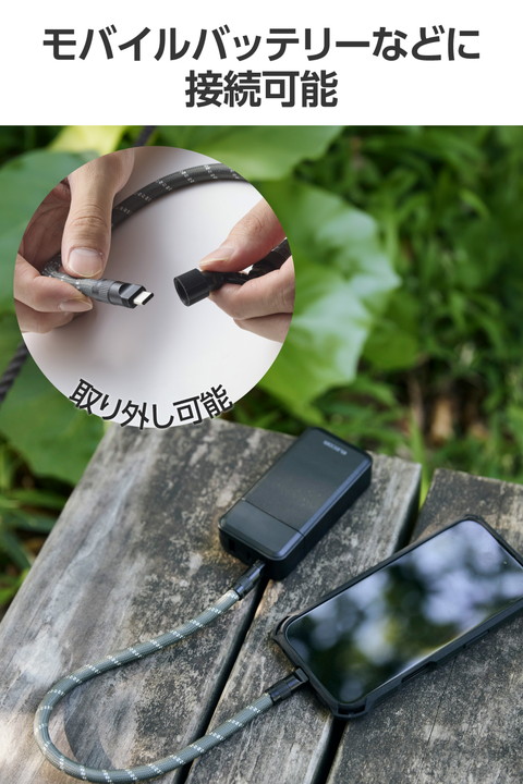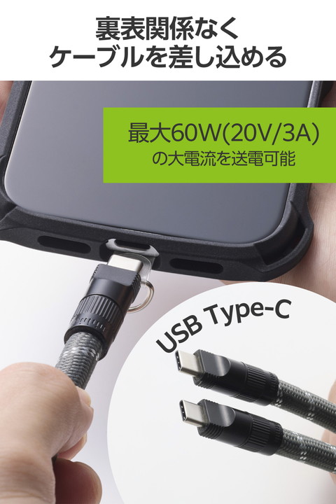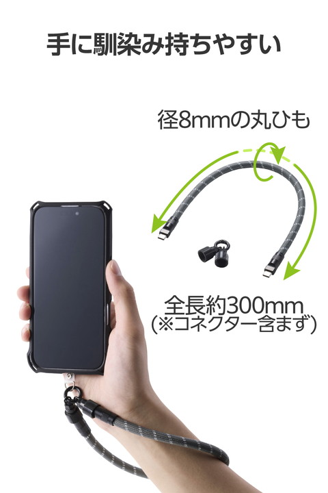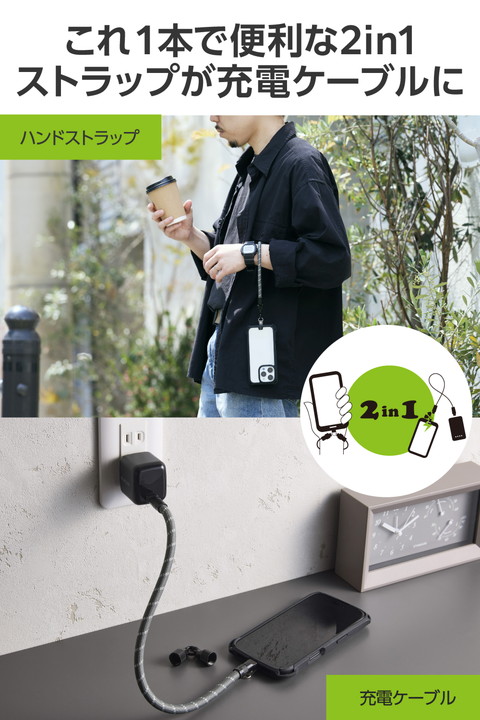 スマートフォン用ハンドストラップとしても、充電ケーブルとしても使える2in1仕様のUSBケーブルハンドストラップです。手首や腕に掛けてスマートフォンの落下を防ぎつつ、両手を自由に保ちながら操作ができます。USB Type-C(TM)に対応し、最大60W(20V/3A)の送電が可能。外出先でも快適に使えます。