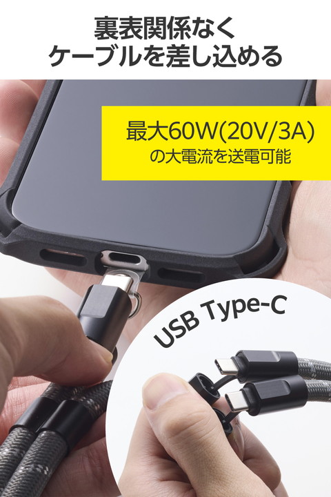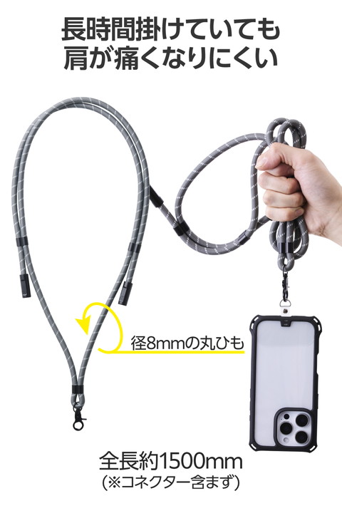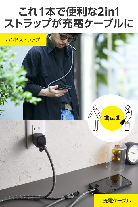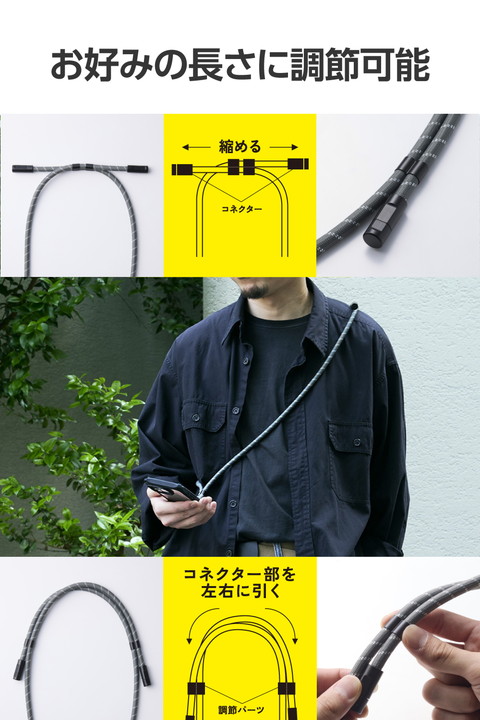 スマートフォン用ストラップとしても、充電ケーブルとしても使える便利な2in1仕様のUSBケーブルショルダーストラップです。調節可能な丸ひもタイプで長時間使用しても肩が痛くなりにくく、普段使いはもちろん、仕事や旅行でも活躍します。USB Type-C(TM)に対応し、最大60W(20V/3A)の送電が可能。外出先でも快適に使用できます。