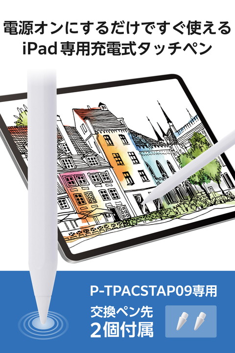 エレコム iPad用 アクティブタッチペン 充電式 パームリジェクション対応 傾き検知 磁気吸着 USB-C充電 急速充電 ホワイト ┃P-TPACSTAP09WWH