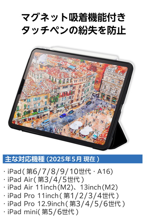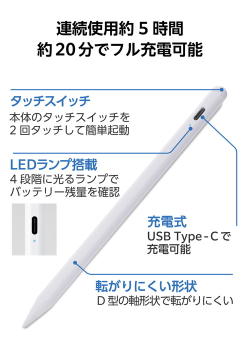隙間時間の充電ですぐに使える!約20分でフル充電可能な急速充電機能を搭載した、iPad用アクティブタッチペンです。約1.6mmのペン先で細かい作業、メモや絵を描くのにおすすめ。ペンの傾き具合で線の太さを変えられる機能や、誤動作を防止するパームリジェクションにも対応しています。![]() ■純正のApple Pencilに近い描き心地の、iPad用アクティブタッチペンです。 ■約20分でフル充電可能な急速充電機能を搭載。電池が切れても充電してからすぐに使用できます。 ■約1.6mmのペン先で細かい作業、メモや絵を描くのにおすすめです。 ■ペン先は導電性に優れたポリアセタール樹脂(POM)を採用し、滑らかな描き心地で画面を傷つけにくいです。 ■ペンの傾きを検知する機能で、傾き具合によって線の太さを変えられます。 ■手のひらが画面に接触した状態でも、ペンを認識して誤動作を防止するパームリジェクション機能を搭載しています。 ■タッチペンの側面にはマグネット面があり、iPadに吸着できるので紛失を防ぎます。 ■※iPadに装着するケースによってはiPad本体のマグネット部分が隠れてしまい、本製品を付けられない場合があります。 ■マグネット面がフラットになっていて、テーブルや床に置いても転がりにくい形状です。 ■USB Type-C(TM)ケーブルで充電が可能で、約5時間の連続使用が可能です。 ■※ご使用状態によっては、目安の時間よりも早く充電が必要になる場合があります。 ■4段階に光るLEDランプでバッテリーの残量が分かります。 ■ペアリングが不要で、電源をオンにするだけですぐに使用できます。 ■操作しない状態が5分間続くとオートオフ機能が働き、電源がオフになるので消し忘れを防ぎます。 ■指先でのタッチ操作と違い、画面を汚す心配が少なく操作できます。 ■タッチ操作はもちろん、スライド・スワイプ操作も快適に行えます。 ■※画面保護フィルムをご使用の際は、タッチペンの跡が残ることがあります。 ■※画面保護フィルムをご使用の際は、フィルムの種類によっては、操作時にこすれ音が生じたり、ペンの反応が悪くなることがあります。 ■交換用のペン先を2個と、USB Type-Cケーブルを付属しています。 ■※本製品にACアダプター(AC充電器など)は付属していないため、出力5V/0.5A以上のUSB出力アダプターを別途ご用意ください。 ■ペン先は、Apple Pencil純正ペン先(第1・第2世代・USB-C・Apple Pencil Pro)との交換が可能です。 ■※USB Type-C and USB-C are trademarks of USB Implementers Forum ■自社環境認定基準を1つ以上満たし、『THINK ECOLOGY』マークを表示した製品です。 ■廃棄物削減に取り組み、製品に同梱する取扱説明書等をペーパーレス化した製品です。 ![]() ■対応機種:2018年以降のiPadに対応(一部機種を除く) ※iOS 12.2以降に更新する必要があります。※2018年以前発売のiPadには対応しません。※2025年5月現在。対応確認済み機種の一覧はhttps://www.elecom.co.jp/r/h712をご覧ください。 ■外形寸法:全長:約166mm、直径:約8.8mm、ペン先:約1.6mm ■材質:ペン先:ポリアセタール樹脂(POM)、本体:アルミニウム・マグネット ■カラー:ホワイト ■質量:約13g ■電池:リチウムイオン電池 ■使用時間:約5時間 ※ご使用状態によっては、目安の時間よりも早く充電が必要になる場合があります。 ■充電時間:約20分 ※使用状況や環境により変化します。 ■保証期間:1年間 ■付属品:USB Type-C(TM) - USB-Type-Cケーブル、交換用ペン先2個 ■筆圧感知:× ■ワイヤレス充電:× ■傾き検知:○ ■パームリジェクション:○ ■備考:※特定のアプリやソフトにおいて、専用タッチペンのみでの描写設定をしている場合は使用できないことがあります。 |