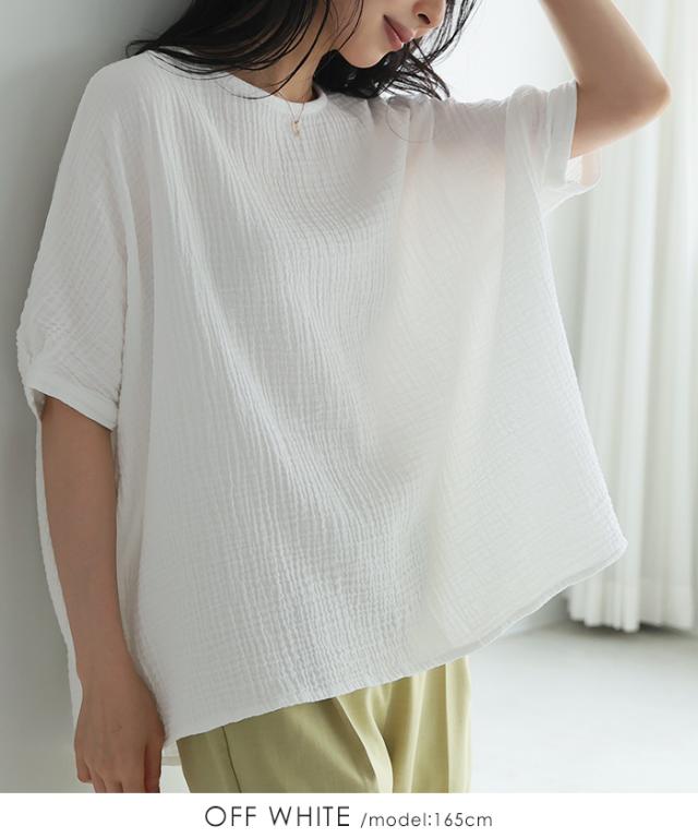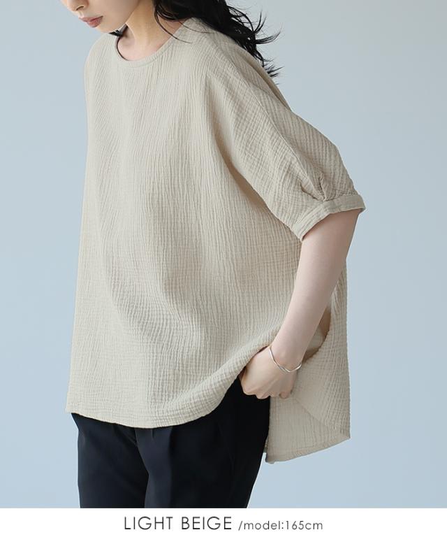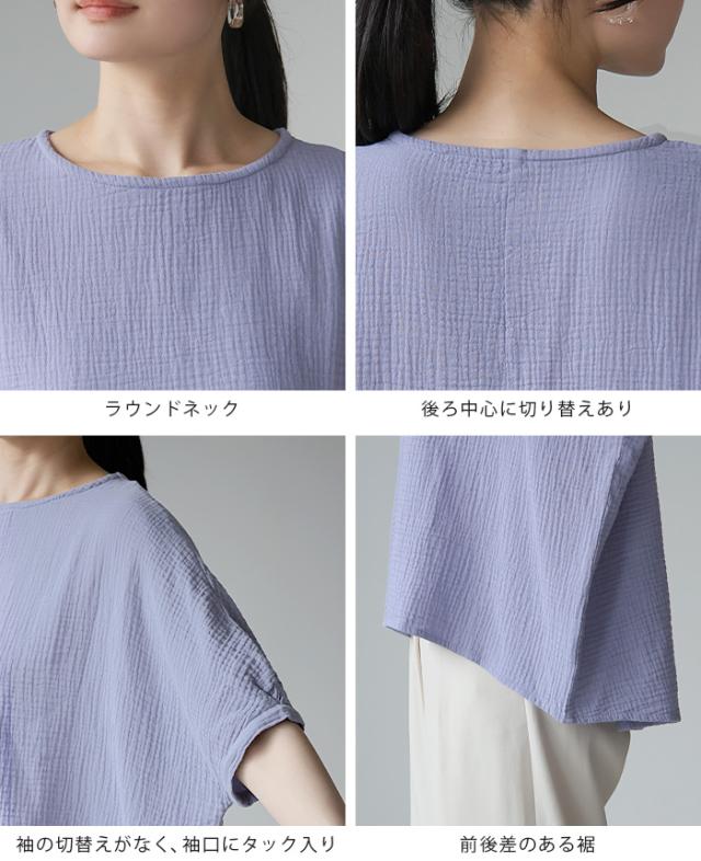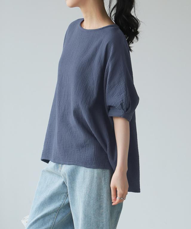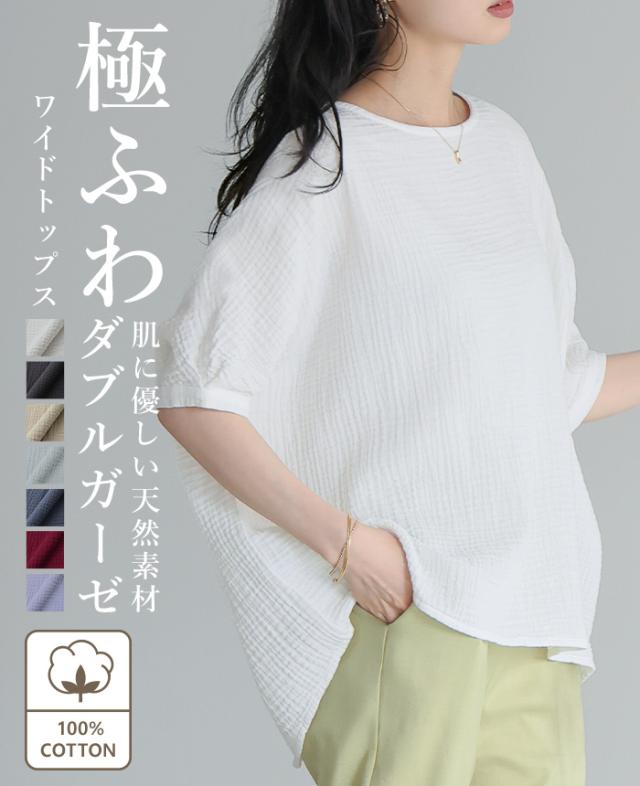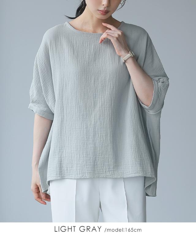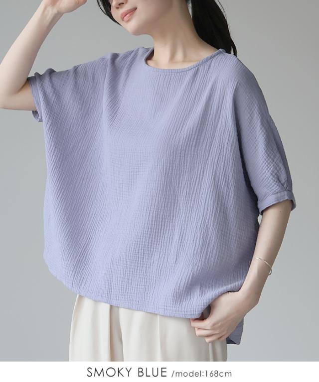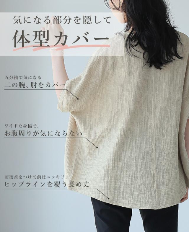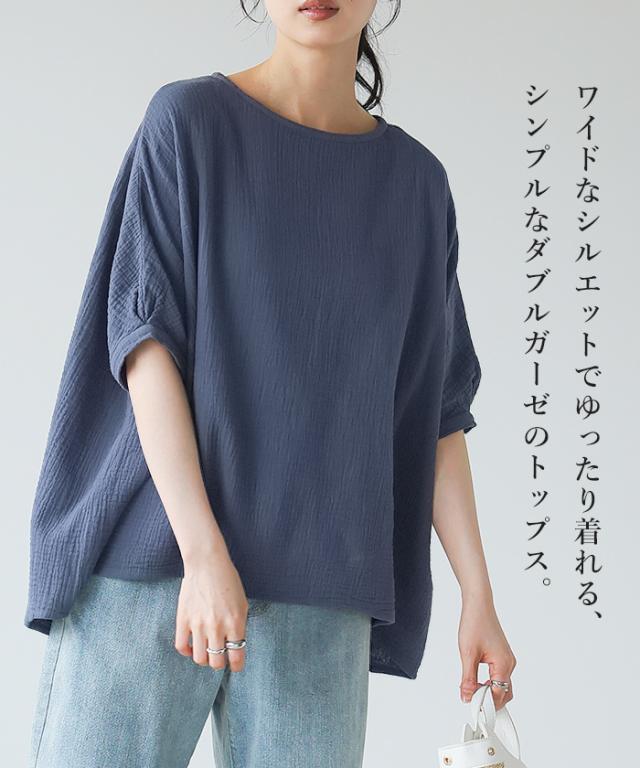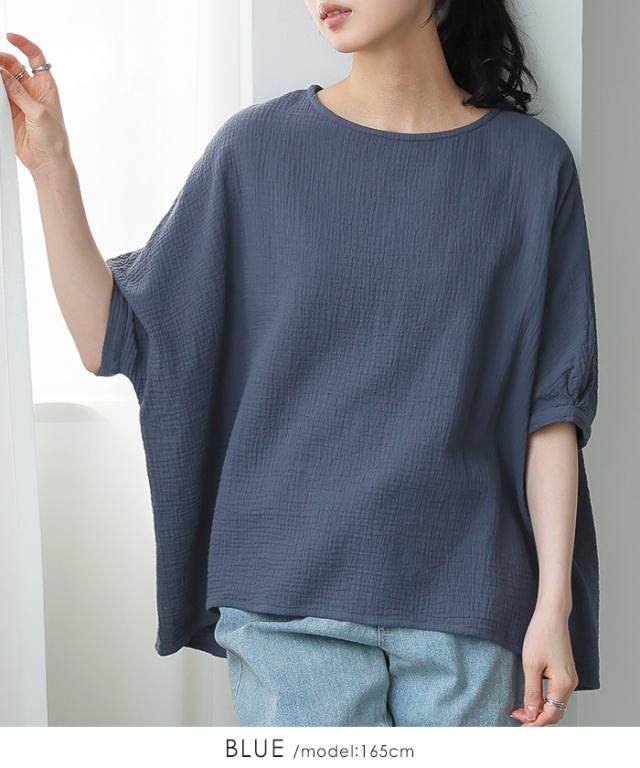 ダブルガーゼ ワイドトップス ブラウス 綿100% ダブルガーゼ Mサイズ レディース 春夏 秋 五分袖 ミドルスリーブ 大きめ ゆったり 無地 ナチュラル 体型カバー【メール便1点まで】[M便 1/1]