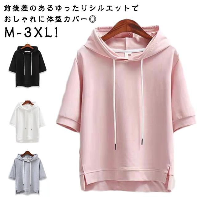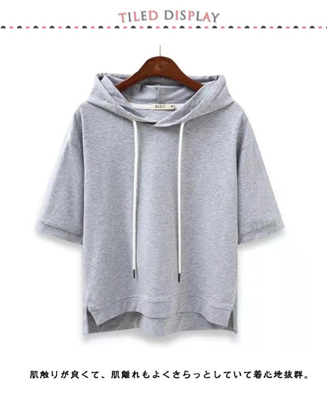 無地 パーカー パーカー パーカー パーカー 夏 春 シンプル トップス 前後差 レディース Tシャツ 春夏 カットソー プルオーバー フード付きtシャツ ゆったり 半袖 部屋着 カジュアル おしゃれ 薄手
