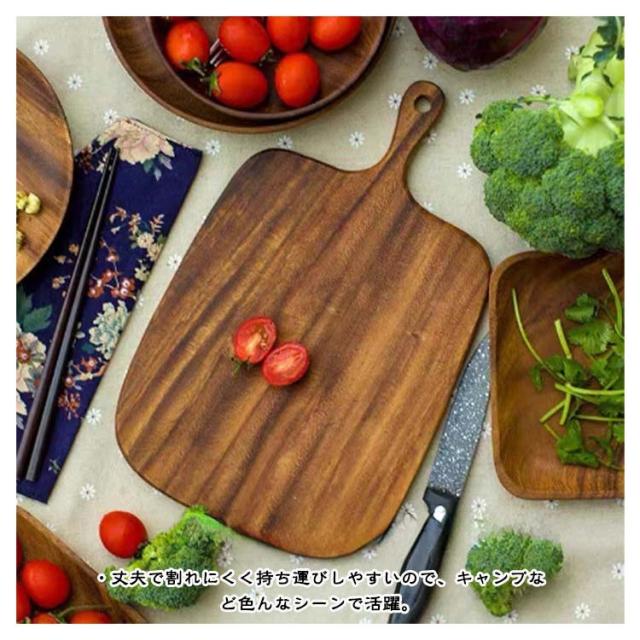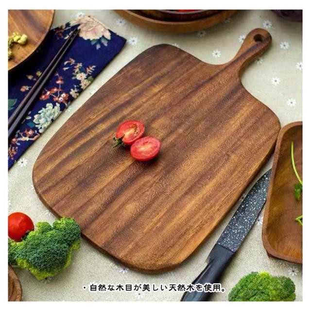 | ・そのまま食卓へ運べるカッティングボード ・まな板としてはもちろん、そのまま盛り付け皿として使える便利なカッティングボードです。 ・自然な木目が美しい天然木を使用。 ・場所を取らず使い勝手の良いサイズ感。持ち手の穴に紐を通してフックに掛けたり、立てかけることもできて収納が省スペース。 ・丈夫で割れにくく持ち運びしやすいので、キャンプなど色んなシーンで活躍。 | |