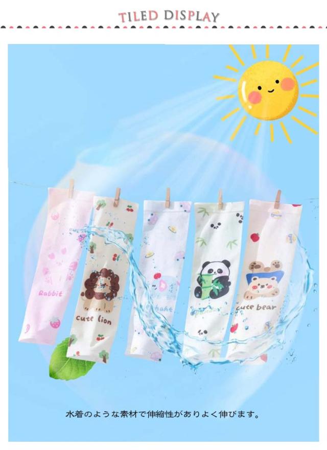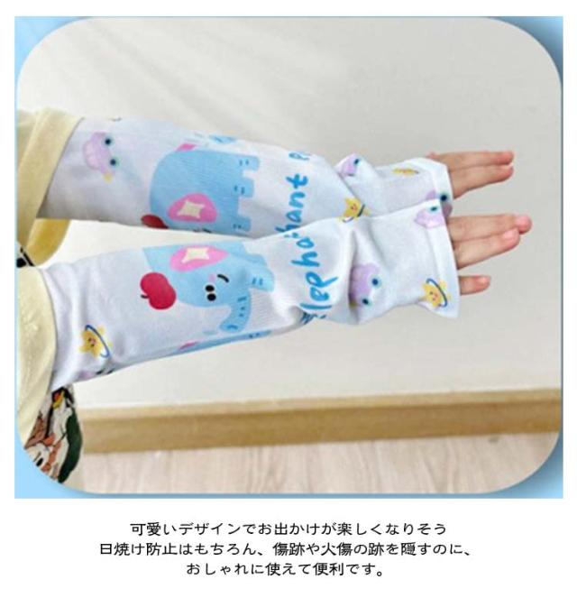 | 冷感素材の日焼け防止ができるキッズ用冷感アームカバーです。 とってもキュートなキッズ用アームカバーです。 汗で日焼け止めを塗ってもすぐに落ちてしまいますが 可愛いデザインでお出かけが楽しくなりそう 日焼け防止はもちろん、傷跡や火傷の跡を隠すのに、おしゃれに使えて便利です。 水着のような素材で伸縮性がありよく伸びます。 細身な作りなのでずり落ちることなく付けられます。 外遊びや海、プール遊び、キャンプ等にも使用出来ます。 | |