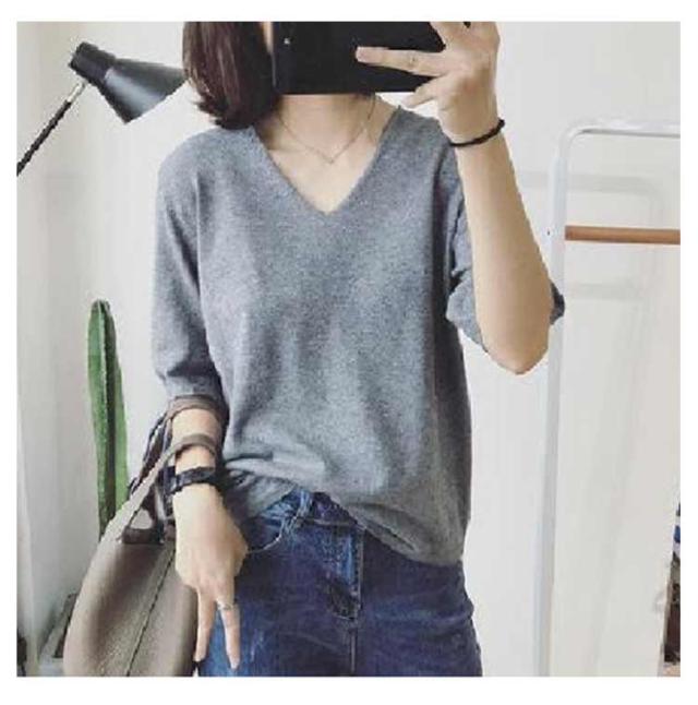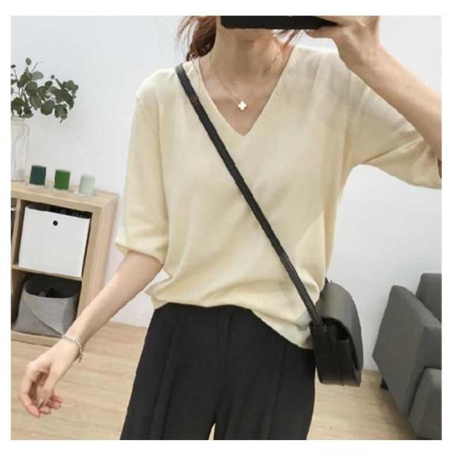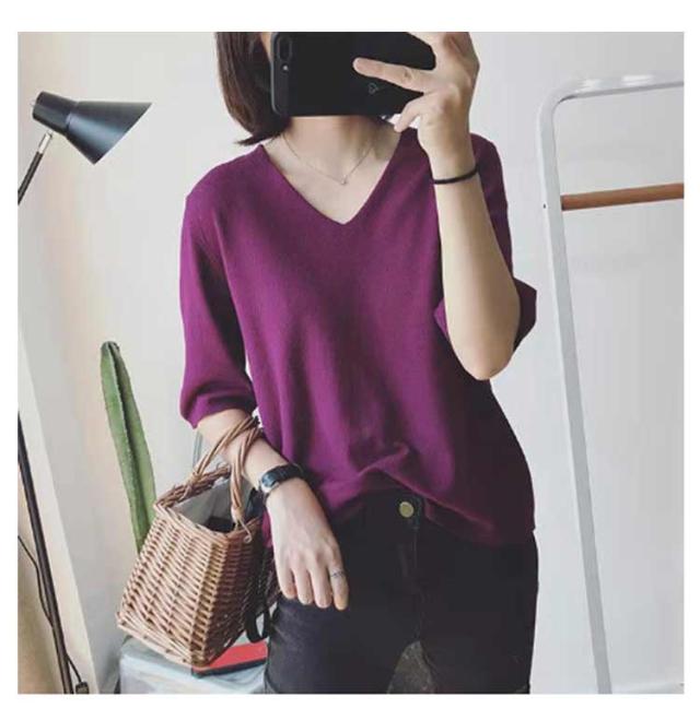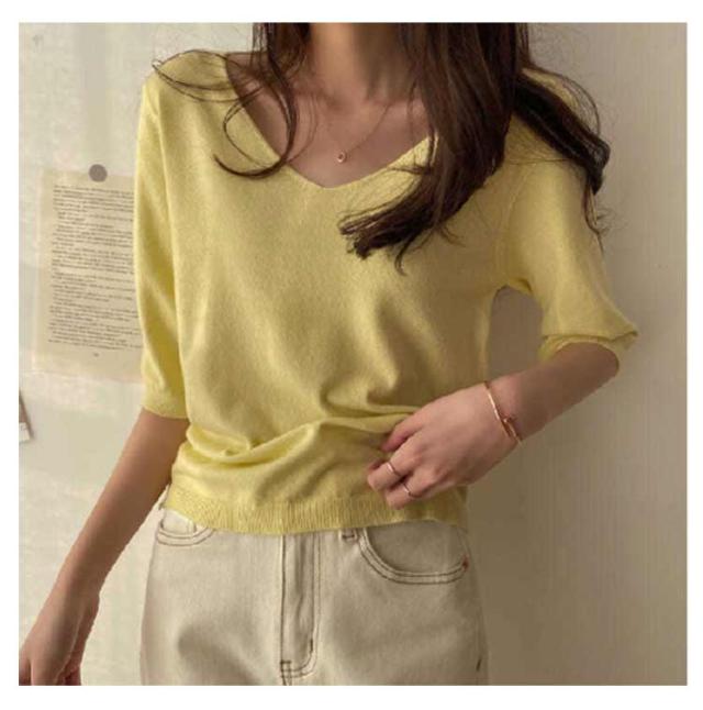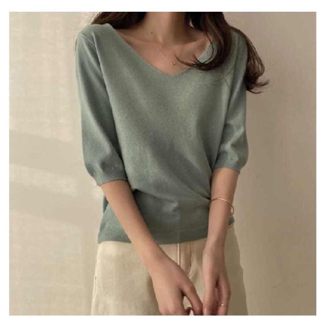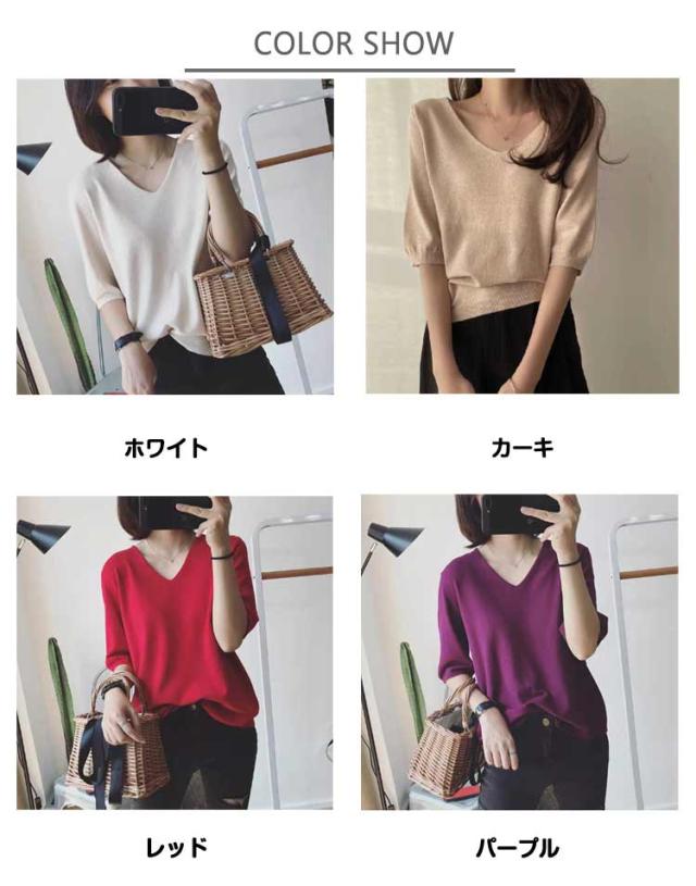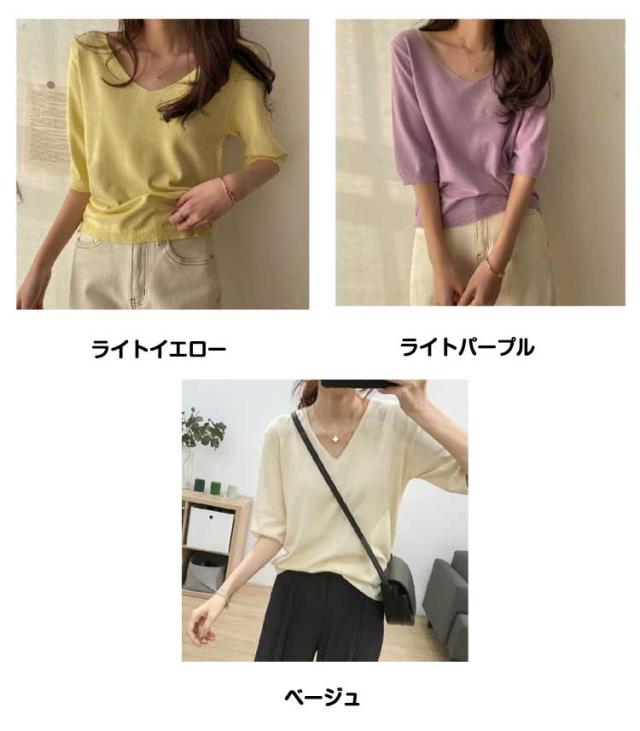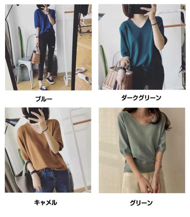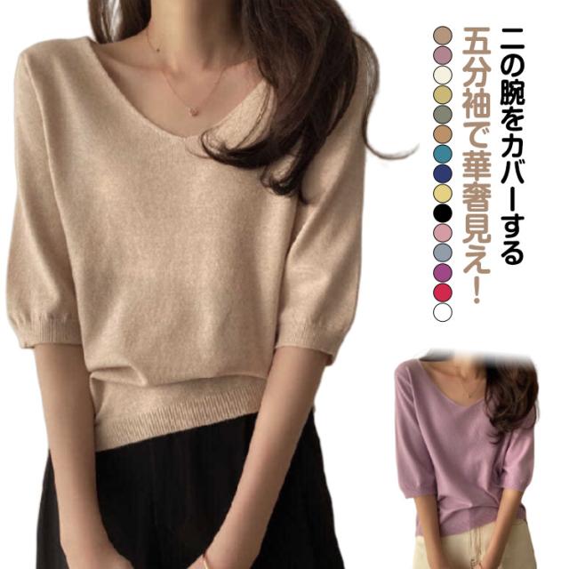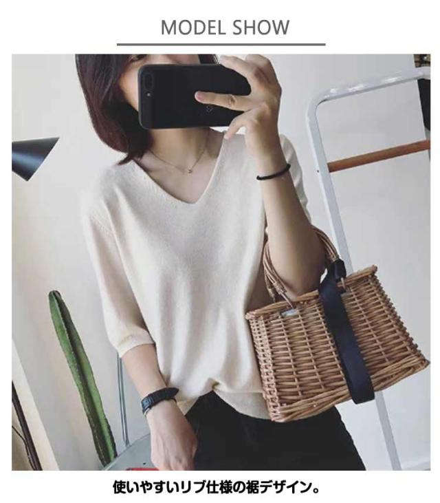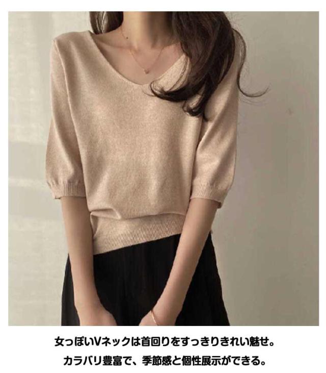 無地 ニット 五分袖 半袖ニット 半袖 レディース Vネック ニット ゆったり トップス セーター ニットセーター カジュアル 大人 シンプル オフィス 通勤 韓国ファッション 女性 おしゃれ 柔らかい 春服 秋服