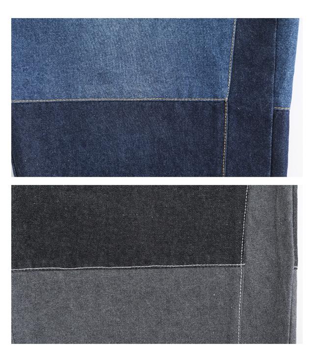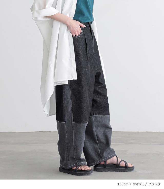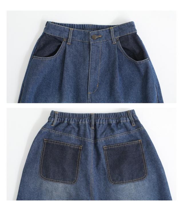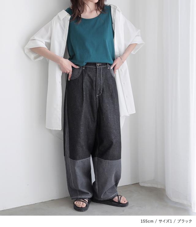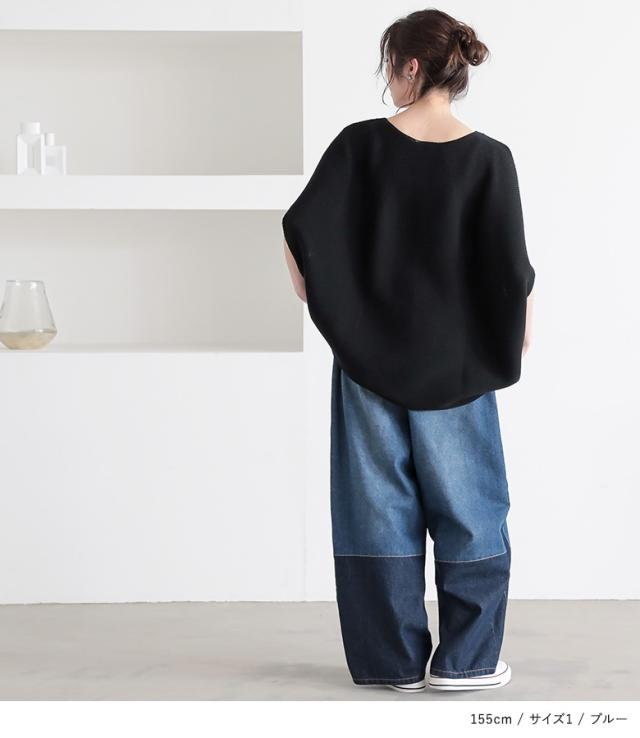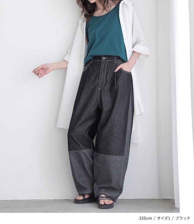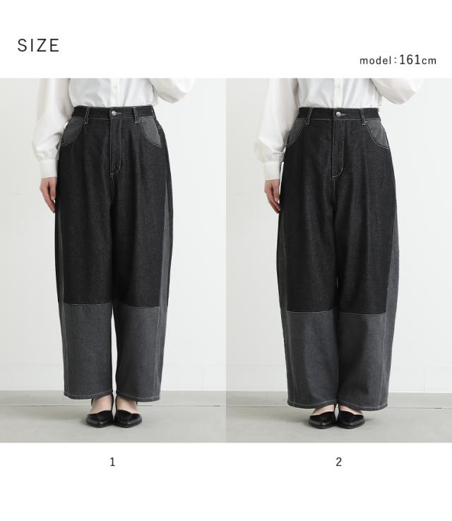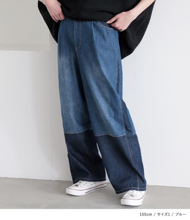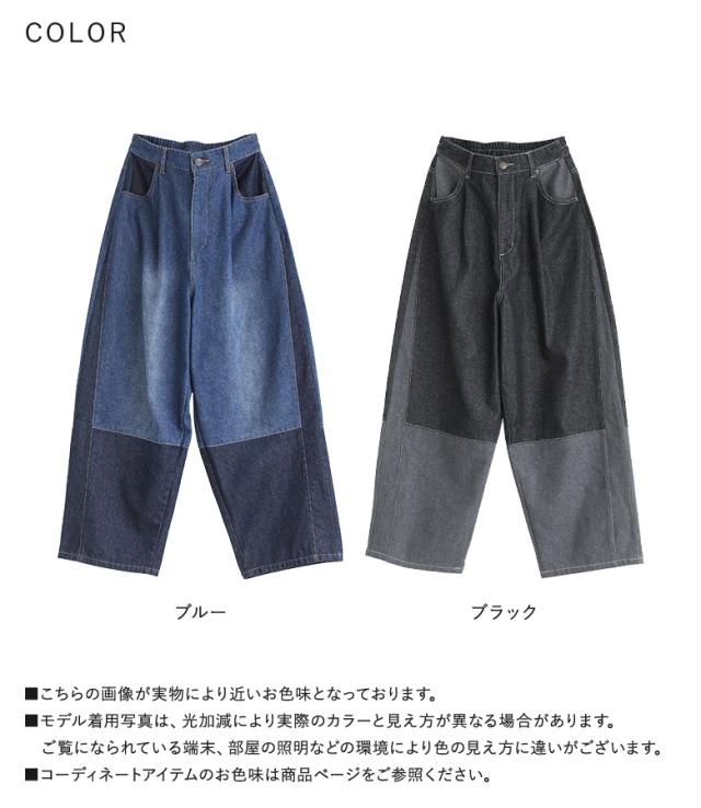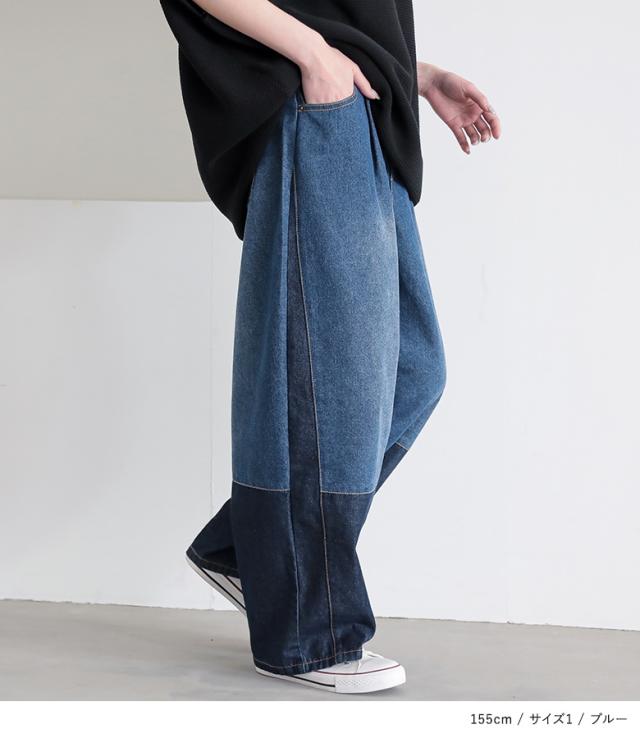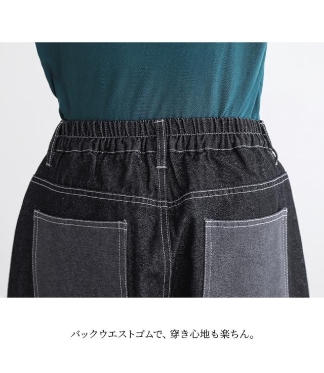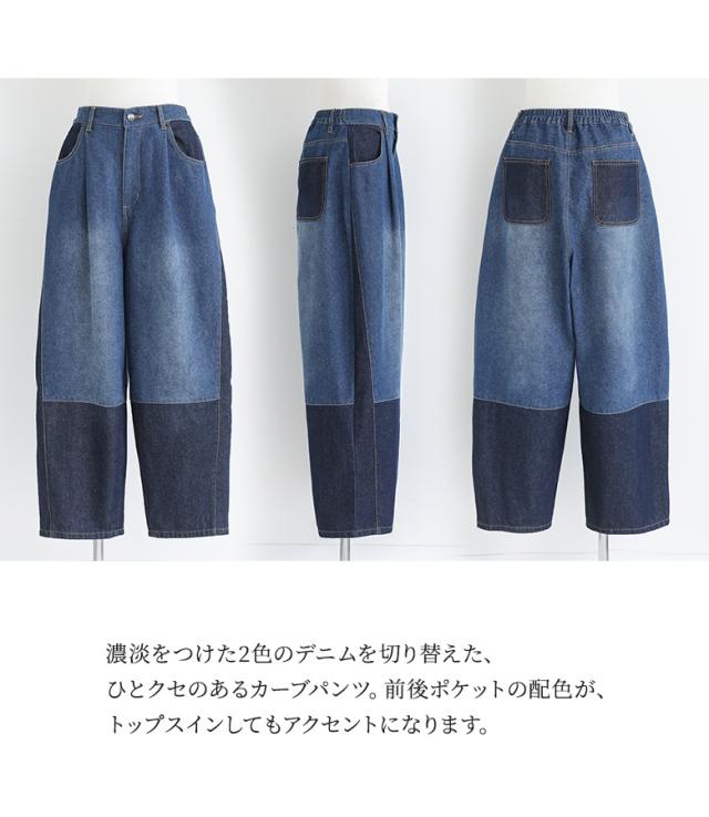『配色デニムカーブパンツ』【メール便不可】【30】[デニム レディース ボトムス ロング丈 カーブパンツ 綿混 ウエストゴム ワイド 配色 ジーンズ ジーパン 春 夏]