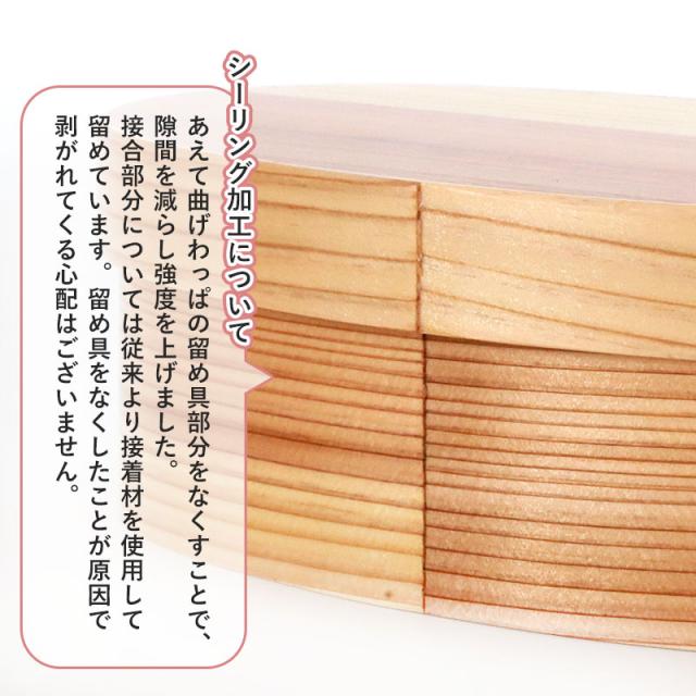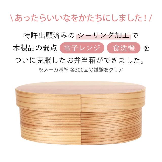 あったらいいなをかたちにしました! 特許出願済みの「シーリング加工」で木製品の弱点「電子レンジ」・「食洗機」をついに克服したお弁当箱ができました。 ※メーカ基準 各300回の試験をクリア 木製でありながら本来なら出来ないことを気にせず使える。 「ほんとうに使いやすい曲げわっぱ」です。 表面にはウレタン塗装が施され、油物などおかずの種類を問わず気軽に使うことができます。 天然杉がうまく呼吸しているので、ご飯がムレず美味しいご飯がいただけます。 木の抗菌作用により暑い時期にはご飯が傷みにくく、寒い日にも天然杉が水分調節をしているのでご飯が固くなりにくく、おいしいご飯をいただけます。 天然木を使用しているので同じ木目・色合いの物は一つとして存在しません。 見て懐かしく、でも、今の時代にはモダンに映る「わっぱ弁当箱」手に取ると、軽くて木の温もりを感じるやさしい気持ちに。 ほのかな木の香りが心地よく、懐かしく温かい気持ちになる使い心地。 日本文化のお弁当を曲げわっぱでおしゃれに普段使いに使っていただければ幸いです。 工芸品が身近にあることで、伝統文化の継承につながればと、ささやかながら願っています。 ご入学、ご就職で、新しい生活がはじまります。 お弁当箱も新しくして、新鮮な感覚を楽しんでみませんか。 自然素材の木のお弁当箱で、ゆっくりと食べるのも良いものです。 取り外し可能なT字型の仕切り付き。 また通常の曲げわっぱお弁当箱と比べて、隙間ができにくい構造を採用し、表面に強度・耐熱性の高いコーティングを施し木地を強化することで30〜60秒程(30秒×2回まで)の電子レンジを使用した加熱が可能です。 電子レンジで温め目安は500W30秒です。 温まりが弱い場合は追加で30秒ずつ温めてください。 ※電子レンジ調理・オーブン・直火使用不可 シーリング加工について あえて曲げわっぱの留め具部分をなくすことで、隙間を減らし強度を上げました。 接合部分については従来より接着愛を使用して留めています。 留め具をなくしたことが原因で剥がれてくる心配はございません。 |