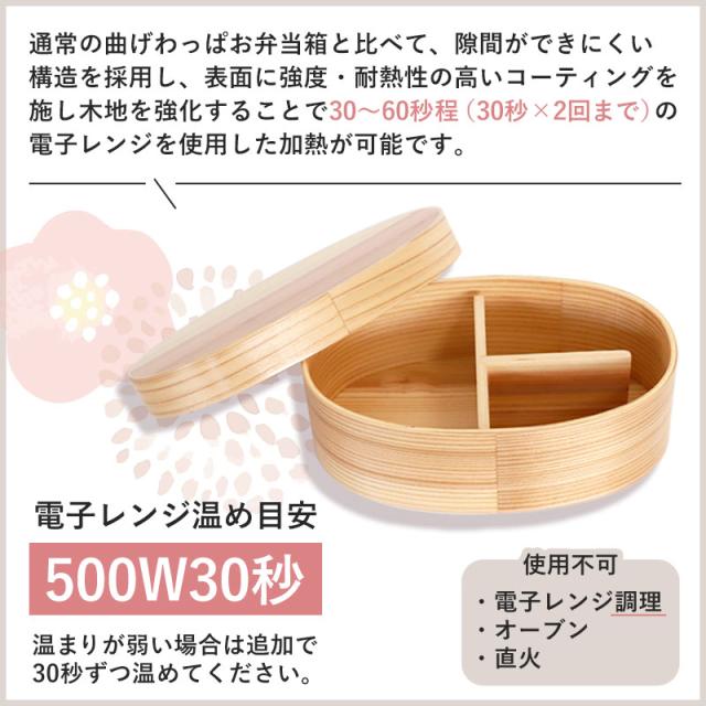 また通常の曲げわっぱお弁当箱と比べて、隙間ができにくい構造を採用し、表面に強度・耐熱性の高いコーティングを施し木地を強化することで30〜60秒程(30秒×2回まで)の電子レンジを使用した加熱が可能です。