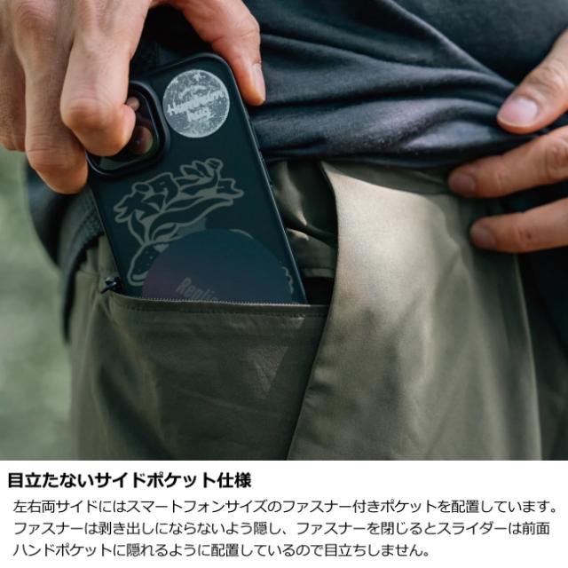 両サイドには目立たないファスナー付きスマートフォンポケット設置。