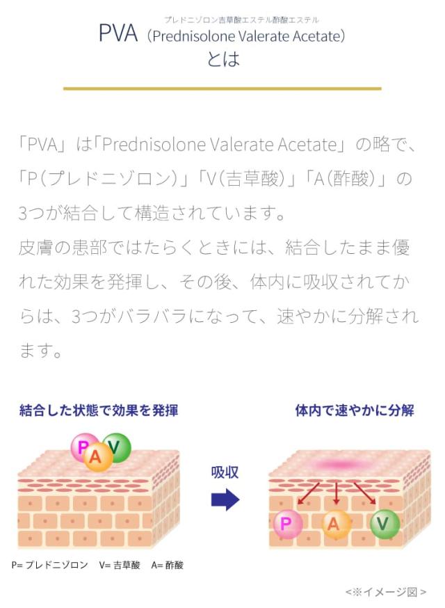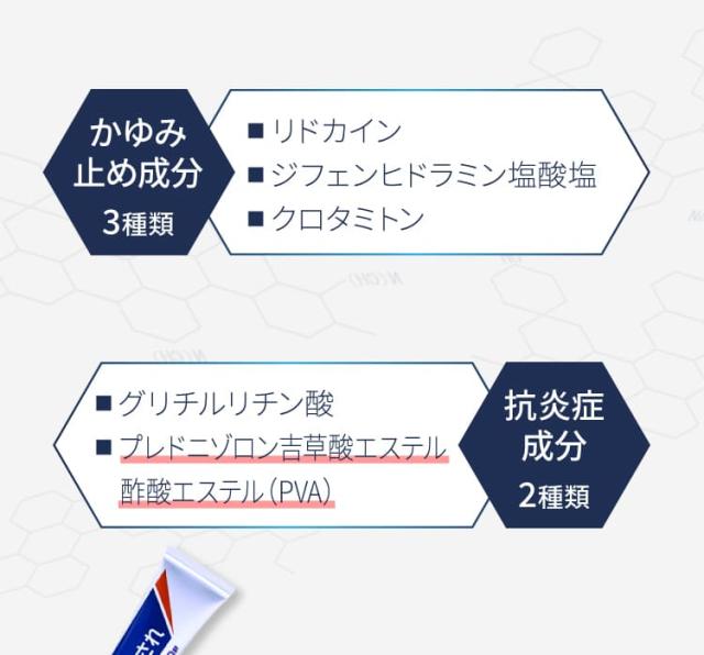 プレドニゾロン吉草酸エステル酢酸エステル(PVA) 1.5mg、グリチルレチン酸 5mg、ジフェンヒドラミン塩酸塩 20mg、クロタミトン 50mg、リドカイン 20mg、トコフェロール酢酸エステル 10mg、アラントイン 2mg、イソプロピルメチルフェノール 1mg、