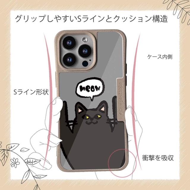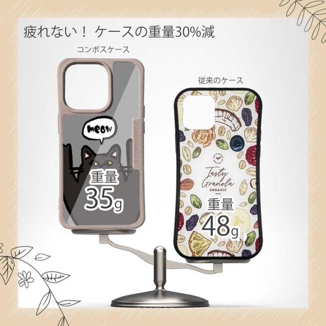 | ケースについて | 背面の内側に入れ込むデザインシートで、シーンに合わせて着せ替え可能。また、グリップしやすいクッション構造で、本体重量は約35gと軽減化を実現。さらに衝撃に強いSライン形状、究極に押しやすいボタン設計(切り込みが入ることで押し込む力を軽減)、背面のカメラ・レンズを保護する高さ設計となっております。生分解性プラスチック素材ながらも着脱もしやすく、割れない・指紋防止加工を施しています。 |