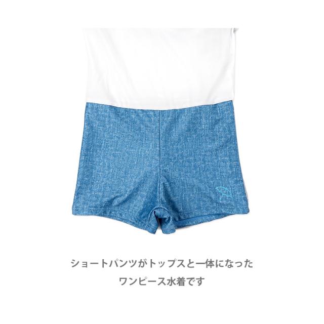 ショートパンツとトップスの水着が一体化したワンピースタイプ。
