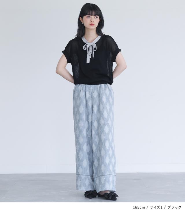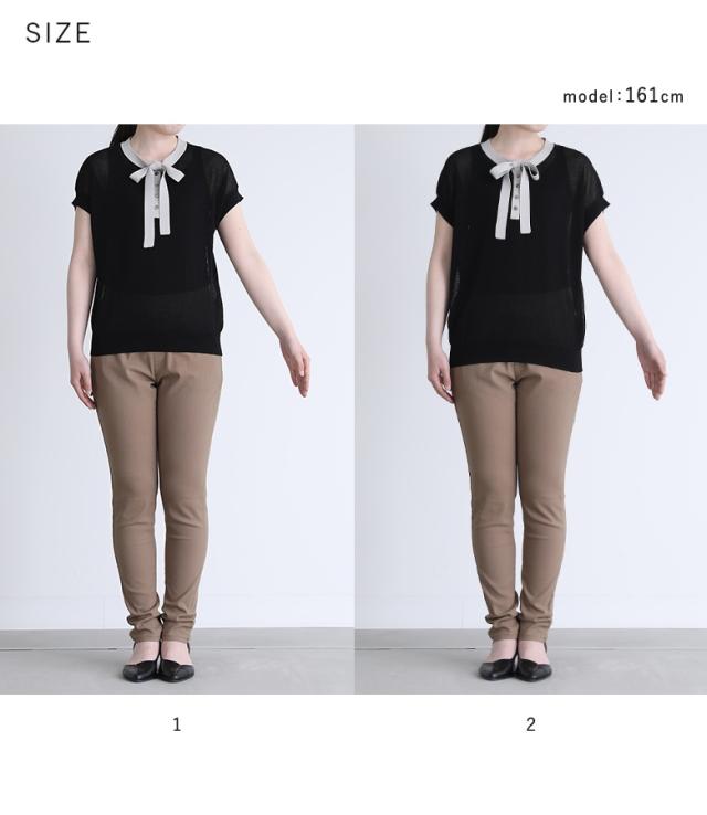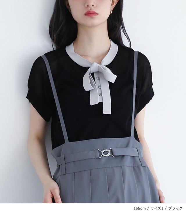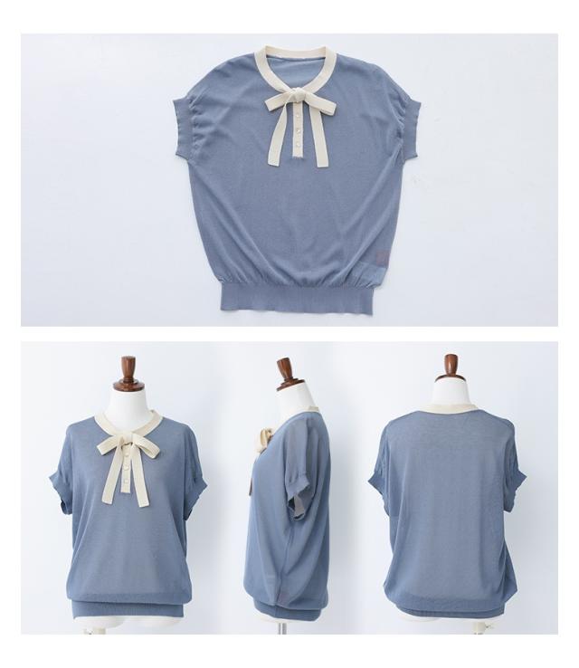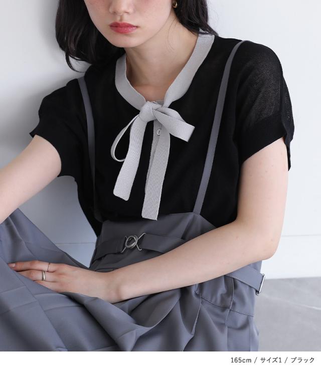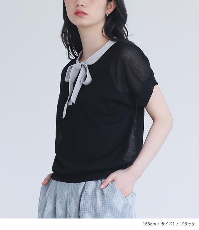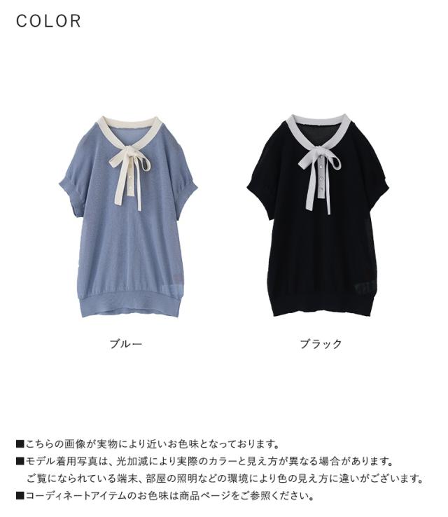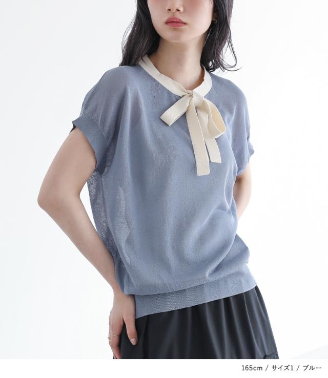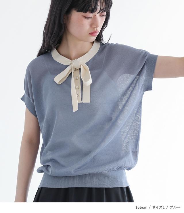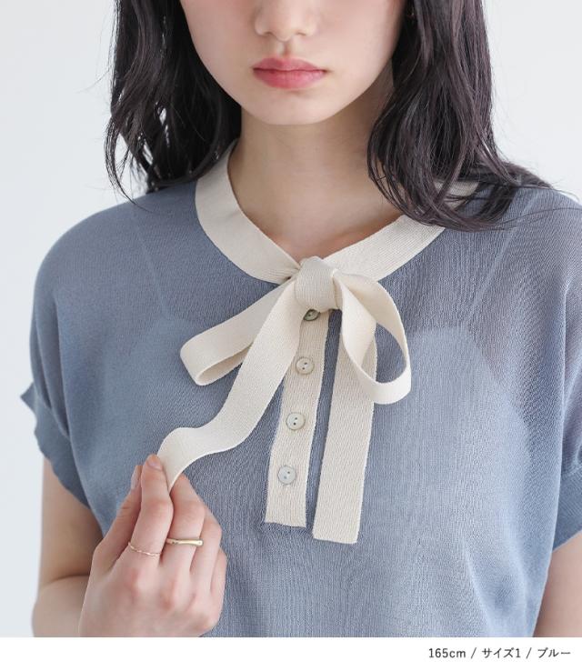『ボウタイ配色サマーニットトップス』※メール便可※【10】[ニット レディース トップス 半袖 サマーニット ボウタイ ハイゲージ シアー 配色 プルオーバー レイヤード 重ね着 春 夏]