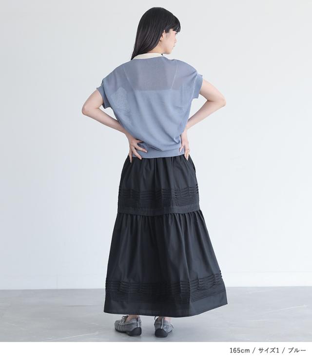 ■デザイン ハイゲージの透け感あるニットプルオーバー。シャリっとした涼しげなサマーニットです。程よく肌見せができ上品な印象に。絶妙な袖丈で二の腕の華奢見せが叶います。ボウタイと前立ての配色デザインがアクセント。首元を華やかにしてくれます。 ■コーディネート ふんわりとしたティアードスカートを合わせると女性らしい柔らかなスタイルに。すとんと落ち感のあるシアー素材とボリューミーなボトムが好相性です。リラクシーなイージーパンツとのコーディネートも洗練されたラフスタイルでおすすめ。一枚持っておくだけでで大人可愛い着こなしの幅が広がります。 ■素材 シャリっとした清涼感のあるニット糸を使用。繊細でシアー感があり程よく肌見せできる素材です。柔らかく軽い着心地なので汗ばむ季節にも快適にご着用いただけます。透け感がある素材なのでインナーのご着用をおすすめします。 ■製品についての注意書き ニット製品につきまして。 ニット素材の持つ特性として編み上げる行程やプレス仕上げによって多少サイズや風合いの個体差が生じる場合がございます。 着用した時と実寸の長さが変わる可能性がございます。 また、着用の際ピリングが避けられず、完全に防止することはできません。毛玉取り器等で丁寧に取り除いてください。 こちらの商品は、 モノフィラメント糸を使用しております為、お肌に刺激を感じる場合がございます。 ご了承の上、ご購入いただきますようお願いいたします。 |