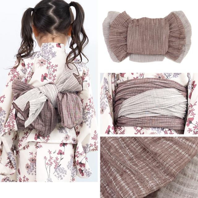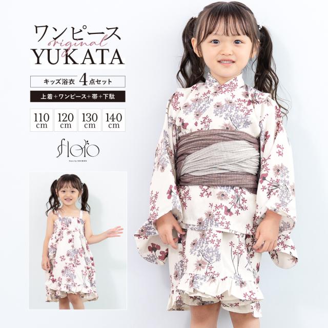 浴衣 セット キッズ 女の子 ワンピース浴衣 兵児帯 セパレート 4点セット floro 白 赤 紫 茶 薄灰 小花 涼しい かわいい モダン フリル 簡単 110 120 130 140 送料無料