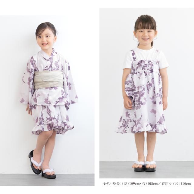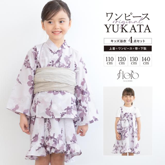 浴衣 セット キッズ 女の子 ワンピース浴衣 兵児帯 セパレート 4点セット floro 紫 紫 ベージュ 涼しい かわいい モダン フリル 簡単 110 120 130 140 送料無料