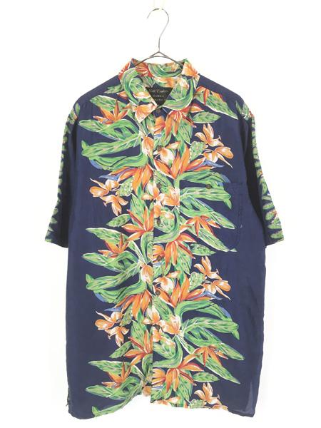 古着 90s Silk Traders ボタニカル フラワー ボーダー 100% シルク アロハ ハワイアン シャツ M