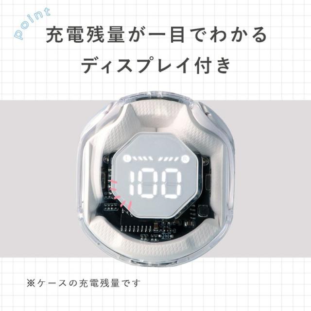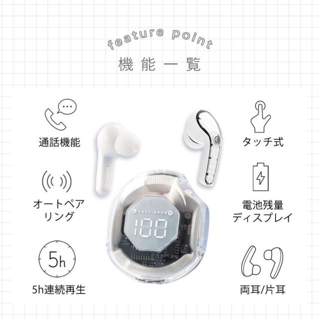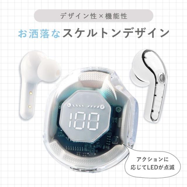 ワイヤレスイヤホン スケルトン Bluetooth イヤホン カナル型 Bluetooth5.3搭載 マイク内蔵 USB充電 電池残量表示 IPX4 防滴 タッチセンサー SBC AAC 対応 20時間再生 コンパクト かわいい iPhone Android PC ゲーム 通話 TWS 片耳 両耳 透明