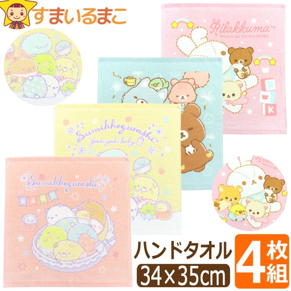 すみっコぐらし リラックマ ハンドタオル 4枚 セット キャラクター タオル 女の子 約34×35cm set1240 サンエックス メール便は送料無料 子供 こども キッズ ジュニア 4枚組 タオルハンカチ ハンカチタオル 綿100% コットン パイル 手拭き 顔拭き qw505 2k5