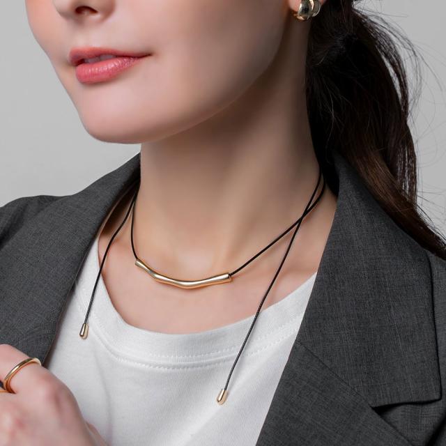 【ゆうパケット送料無料】 ネックレス レディース ロングネックレス レザーコード コードネックレス PUレザー メタルパイプ 紐 長さ調整 ラリエット スライド式 大人 ブラック ゴールド シルバー