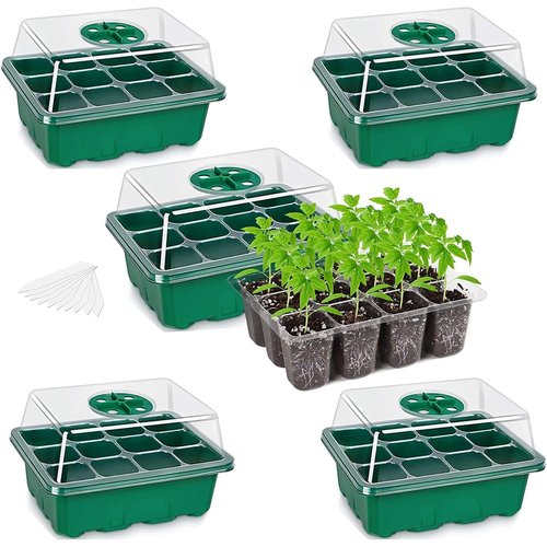 GRERLLD育苗ポット12穴 育苗トレイ 育苗箱 種子トレイ 種まきハウス 苗箱 発芽?育苗セット 透明カバー 便利性 耐久性 通気性 菜園 家庭菜園 園芸 種 5セット入り