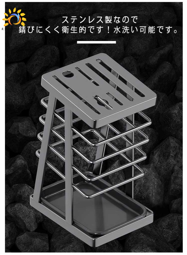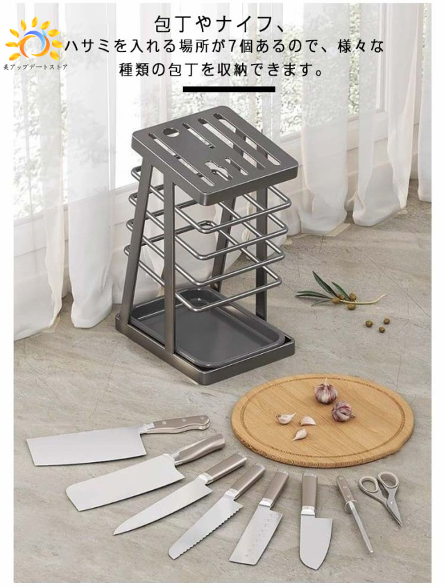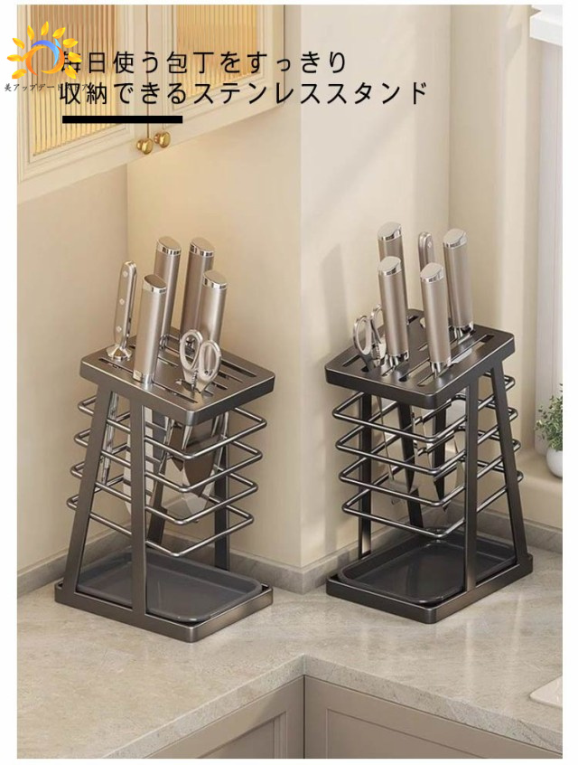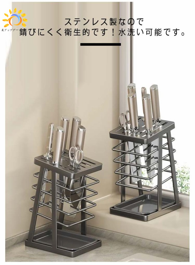 | 毎日使う包丁をすっきり収納できるステンレススタンド 風通しの良い構造なので洗ったばかりの包丁の乾燥にも便利です。 垂直に収納するため、水キレも良く、刃も隠れますので怪我を防止することができます 包丁やナイフ、ハサミを入れる場所が7個あるので、様々な種類の包丁を収納できます。 片手でサッと取り出せるデザインで調理の効率もアップします。 ステンレス製なので錆びにくく衛生的です!水洗い可能です。 底に水受けトレイが付いているので、キッチンを衛生的に整頓できます。 | |
