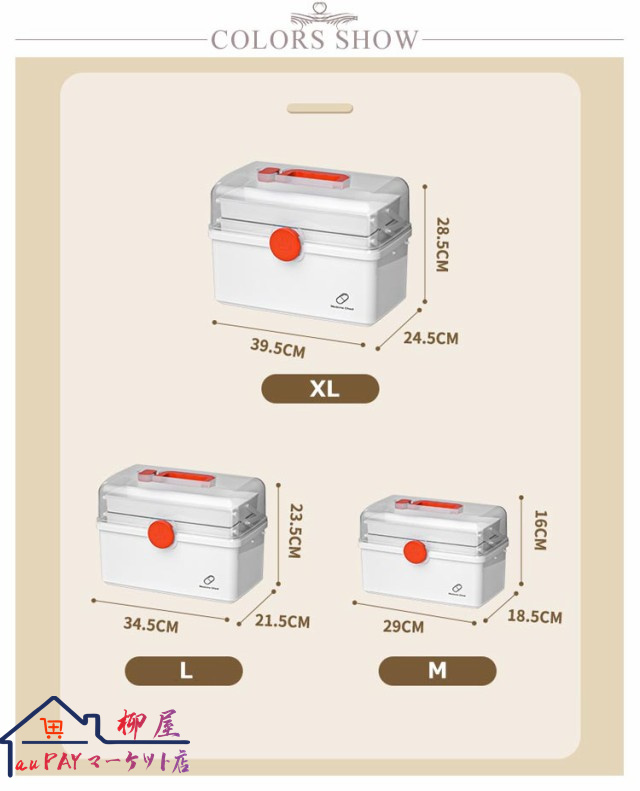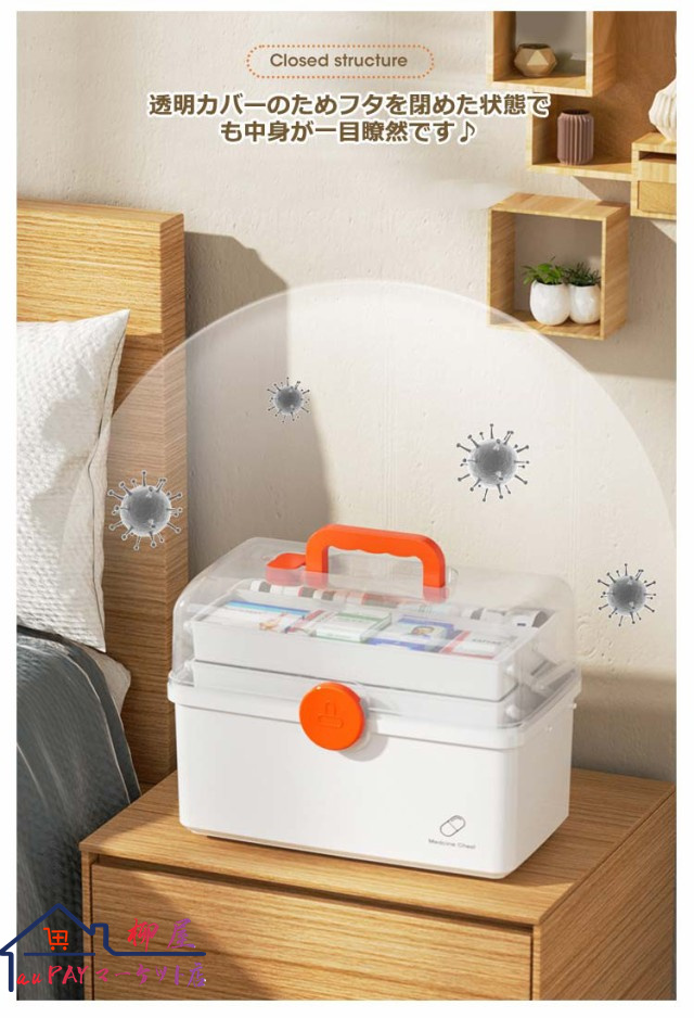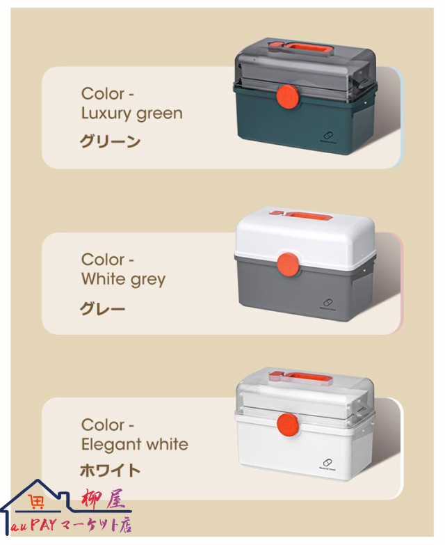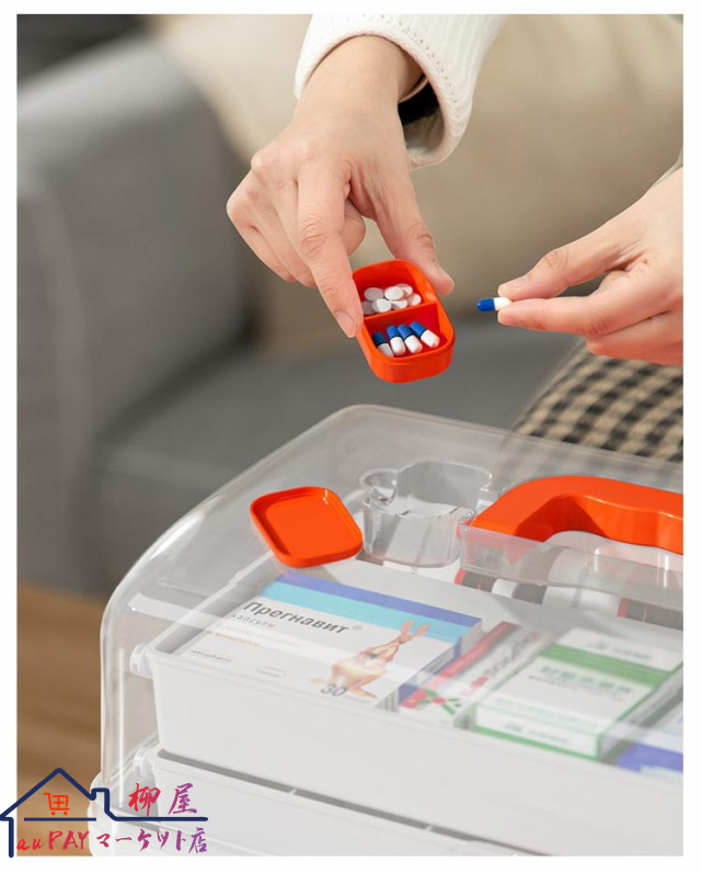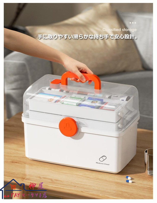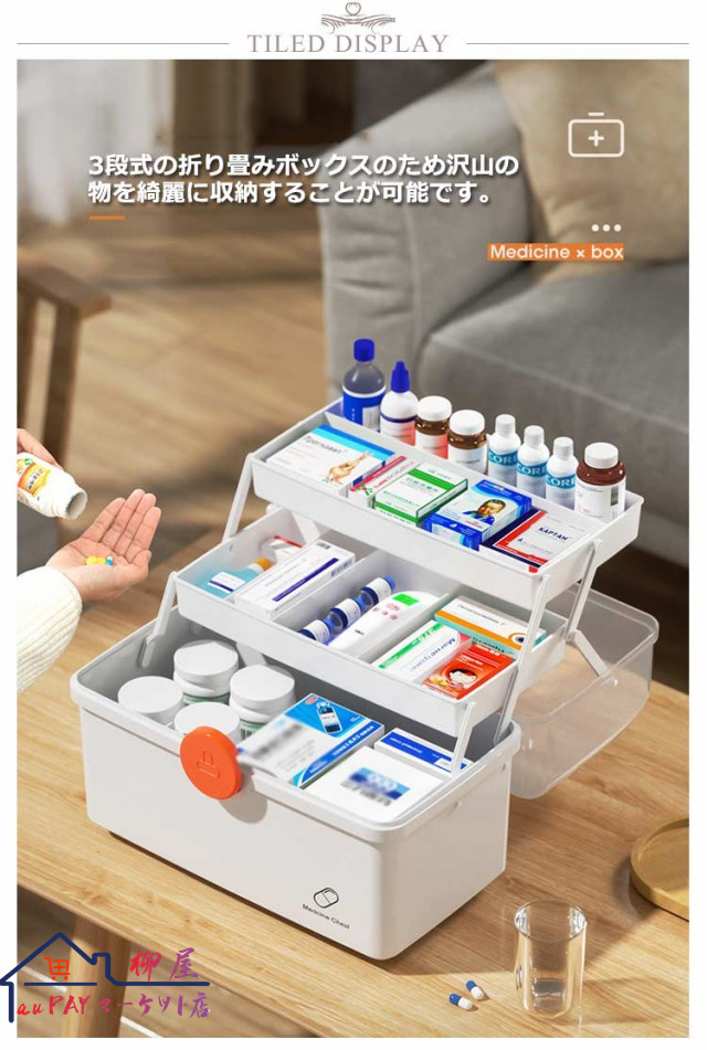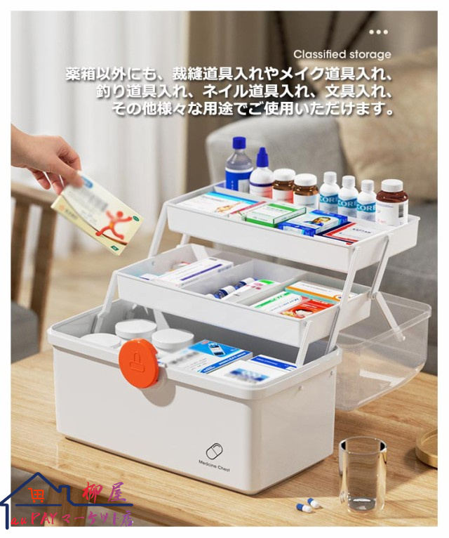 | 3段式の折り畳みボックスのため沢山の物を綺麗に収納することが可能です。 開閉部分には「回転式安全ロック」を採用し、フタを完全ロックすることで、持ち上げた際にフタが開き中身が落下することを防ぎます。 手に取りやすい滑らかな持ち手で安心設計。 透明カバーのためフタを閉めた状態でも中身が一目瞭然です? 薬箱以外にも、裁縫道具入れやメイク道具入れ、釣り道具入れ、ネイル道具入れ、文具入れ、その他様々な用途でご使用いただけます。 | |