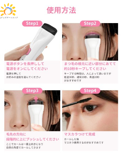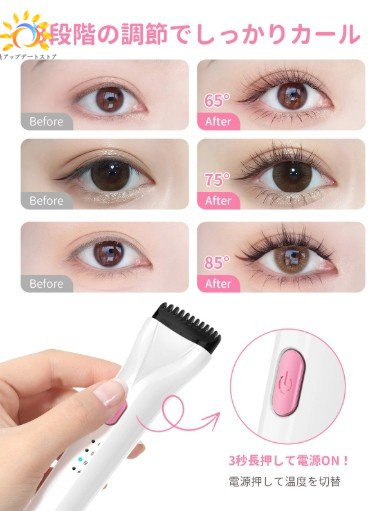 ワンボタンで温度が切り替えられ、温度検知役のお知らせシリコンもつけております。 マスカラのブラシに模倣したやけど防止デザインは、まつげの流れを梳かし、より綺麗な角度にカールさせることができます!