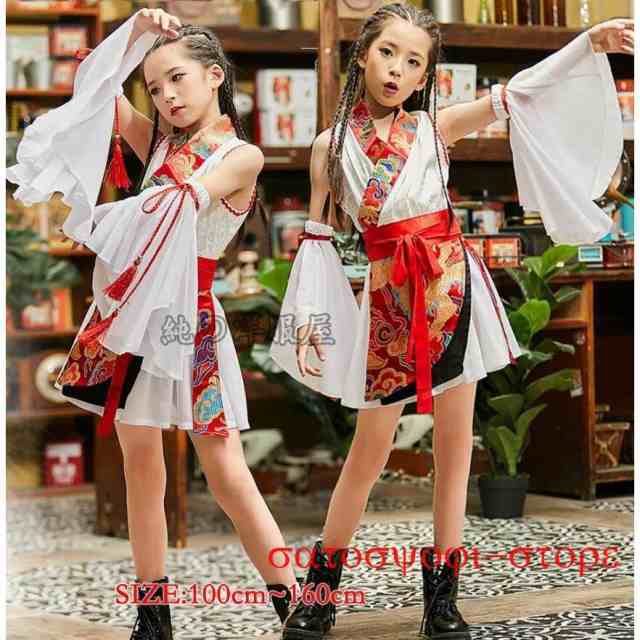 子供中華風ダンス衣装4点セット チャイナ風 和風 膝丈 チャイナドレス 着物 女の子 中華ドレス 中華コスプレ衣装 フリル付け袖 姫袖 中国風 ジャズ ストリートダ