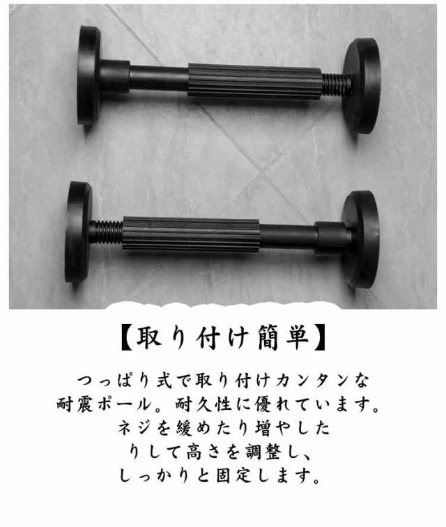 | 2本セットで耐圧400kg! 18-45cm高さ調整可能突っ張り棒 つっぱり式で取り付けカンタンな耐震ポール。耐久性に優れています。ネジを緩めたり増やしたりして高さを調整し、しっかりと固定します。女 家具転倒防止伸縮棒はガラスファイバーナイロン素材で、防水・防湿、耐食性に優れ、耐圧重量400kg(2本で)、安心の品質。 テーブル、本棚、棚、冷蔵庫、キャビネット、その他の場所で広く使用できます。 地震発生時に家具の転倒を防ぎ、被害を最小限に抑える防災グッズです。 穴あけすることなく、天井や家具に傷つきにくく、賃貸でも安心して使えます。 | |