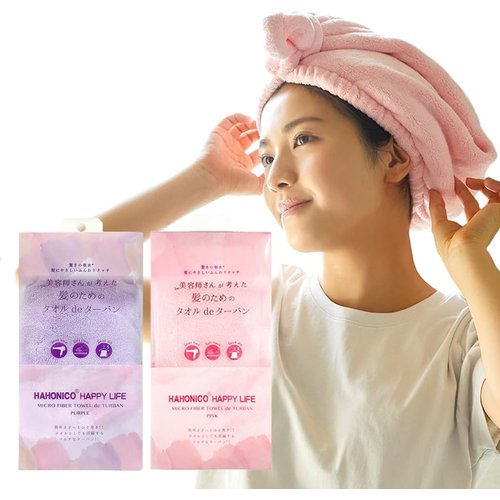 ハホニコ ヘアドライマイクロファイバータオル「美容師さんが考えた髪のためのタオル」のスナップボタンのついたターバンタイプです。生地は美容師さんが考えた髪のためのタオルと同じものを使用しているので、吸水性に優れ、水分を瞬時に拭き取りドライヤーをかける時間を大幅に短縮します。ヘアドライタオルにスナップボタンが付いたような形状で簡単に頭に巻くことができるので、お風呂上りにサッと巻くだけで髪の水分を吸収してくれます。お風呂上りには、サッと頭に巻いて、フェイスケアやお化粧を行い、その後、髪をおさえ拭きすることで髪に残った水分をしっかり吸収し、ドライヤー時間を短縮することができます。ドライヤー時間が短縮=ドライヤーの熱によるヘアダメージを抑えることができます。
