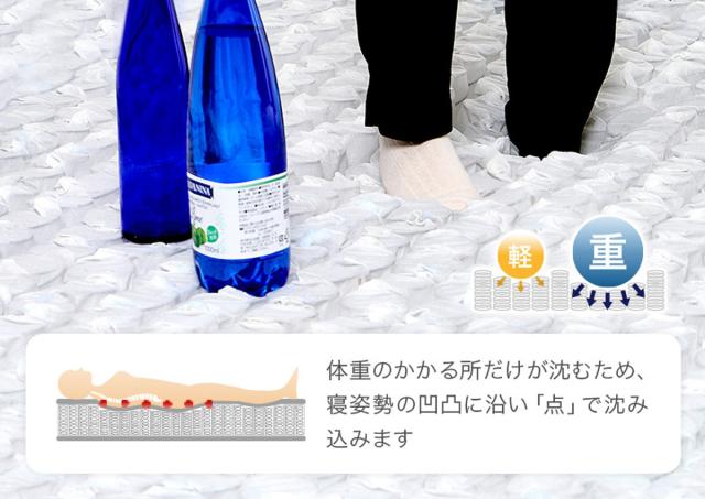 身体を点で支える体圧分散性に優れたポケットコイルマットレスです。それぞれ独立したコイルが、体のラインに合わせて沈み込み、自然な体勢を保てます。コイルは通気性に優れた並行配列で、より快適にお休みいただけます。