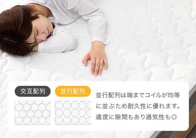 コイル同士の接触が少ない「並行配列」を採用しています。並行配列は端までコイルが均等に並ぶため耐久性に優れています。適度に隙間があり通気性も良いので安心です。