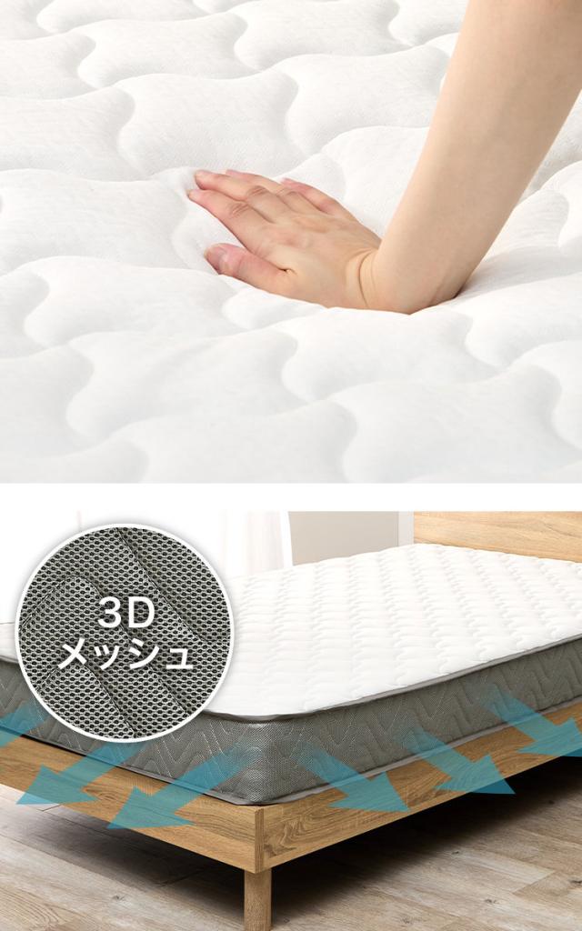 表面には高級マットレスに使用されるニット生地を採用しています。伸縮性に優れ、寝返りの際も身体に優しくフィットします。側面は全てメッシュ素材です。マットレス内に溜まった寝汗などの湿気を放出しやすくし、快適で清潔な状態をキープします。