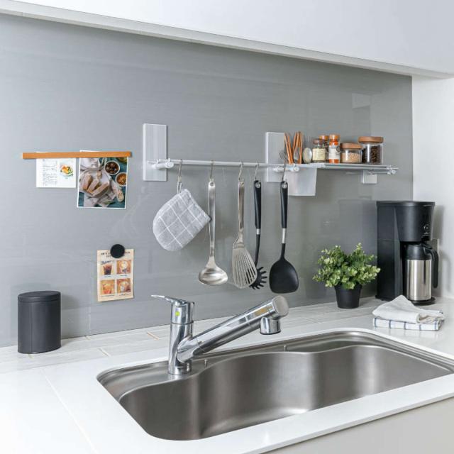マグネットで浮かせられるので、キッチンのデッドスペースを有効活用できます。また身長や作業台の高さなどに合わせて、心地よく使える高さに取り付けられます。耐荷重は約1.5kgで、調味料を置くのにぴったりです。