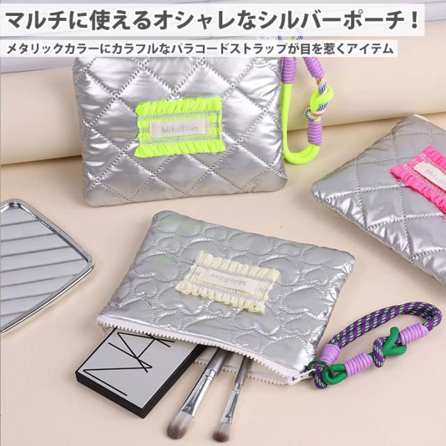 パラコードストラップ付きメタリックシルバーキルティングポーチ レディース ポーチ 小物入れ マルチポーチ メイクポーチ 化粧ポーチ コスメ バニティ 軽量 おしゃれ かわいい 大人 子供 キッズ 旅行 トラベル ミニポーチ コスメポーチ 化粧品 メイク道具 ペンケース 筆箱 キルティング パフ ハート リボン パラコード キーホルダー 可愛い ガーリー カジュアル 仕事 学校 キルト シンプル カラフル メタリック キラキラ シルバー 銀 アイボリー ホワイト 白 パープル 紫 グリーン 緑 オレンジ ネオン 蛍光色 ピンク ミント フラットポーチ ペンポーチ 筆入れ ペン入れ ふでばこ 文房具 筆記用具 文具 定規 15cm パラコードストラップ ストラップ キーリング 持ち手 持ち手つき ファスナー 収納 女子 女の子 化粧 小さめ 小さい 軽い コンパクト 整理整頓 お洒落 オシャレ カワイイ ポップ 韓国 北欧 海外 y2k レトロ 平成 ギャル 派手 個性的 会社 オフィス ビジネス OL 事務 出張 社会人 学生 小学校 低学年 中学年 高学年 中学校 高校 大学 小学生 中学生 高校生 大学生 通園 入園 保育園 幼稚園 園児 年少 年中 年長 春夏 秋冬 春 夏 秋 冬 トレンド 流行り 人気 デイリー 普段使い プレゼント ギフト 贈り物 新生活 卒業 卒園 入学 進学 新学期
