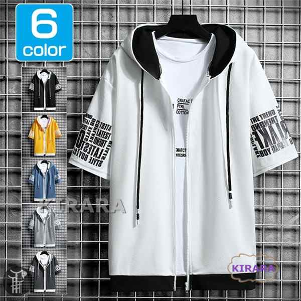 パーカー 半袖 メンズ フード付き ジップアップ 英文字 カジュアルアウター 夏服 半袖パーカー トップス 男性 スポーツ プリント 運動 スウェット 上着