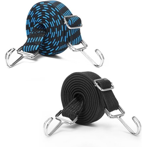 MYLCHBDJゴムロープ 荷台用 ゴム紐 ゴムひも ゴムバンド フック付き 2本入り 荷物 固定紐 ベルト 荷台 荷締め 金属製フック付き 弾性よい 丈夫 荷崩れ防止 長さ調節可能 バイク/オートバイ/自転車用 荷物固定 2m×3cm ブラック&ブルー